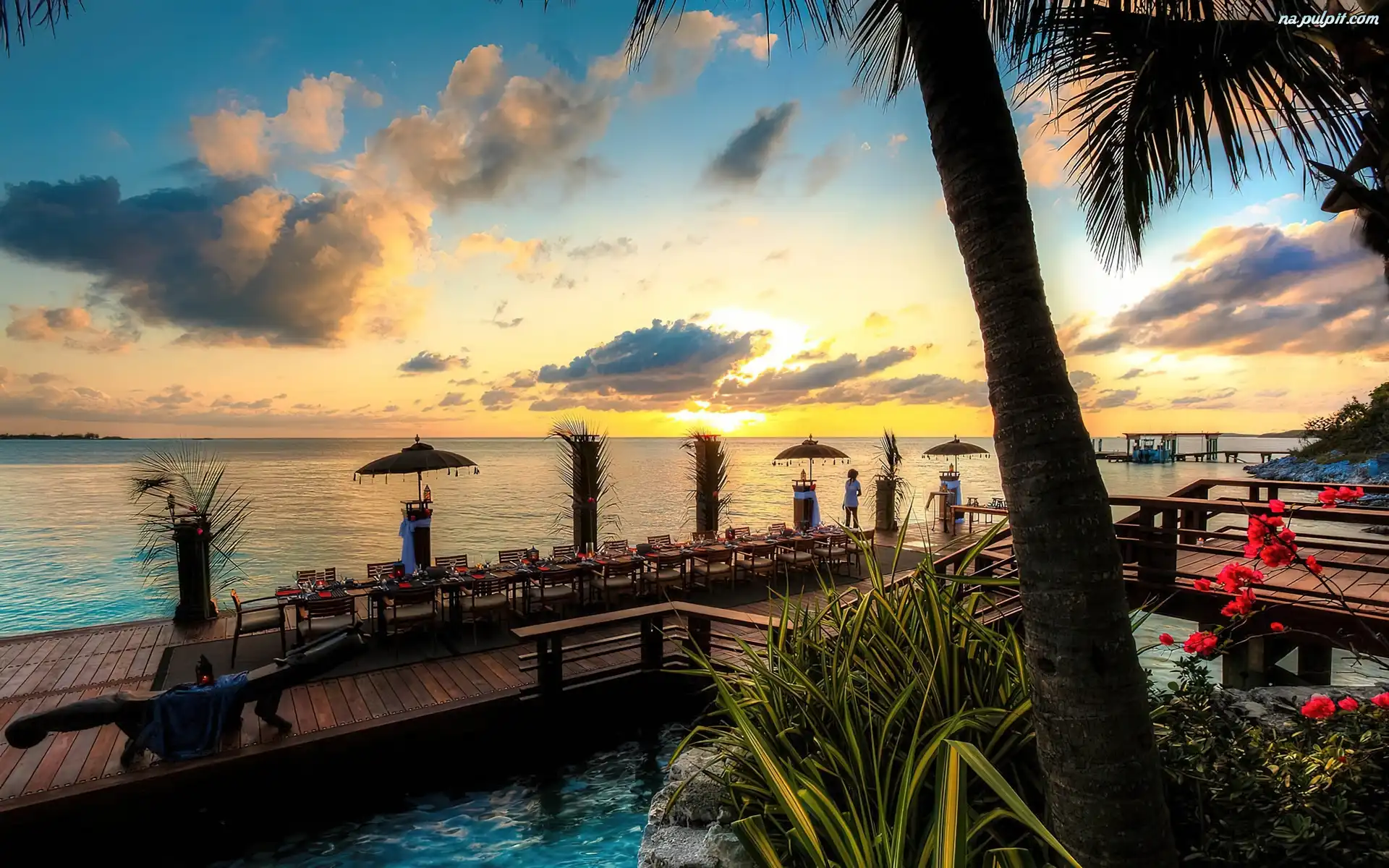 Restauracja, Słońca, Zachód, Morze, Molo Na Pulpit