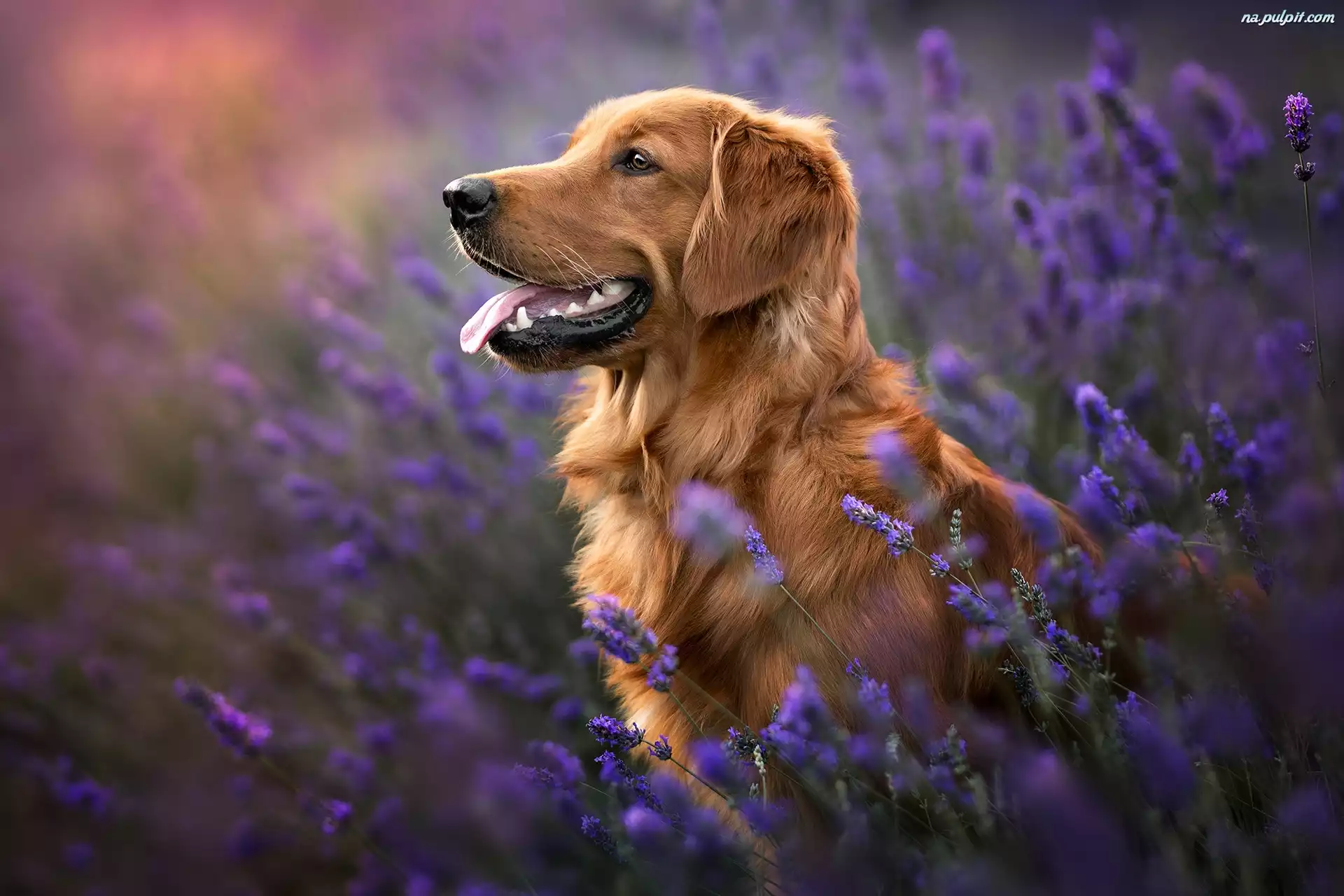Kwiaty, Pies, Golden retriever, Lawenda, Język Na Pulpit