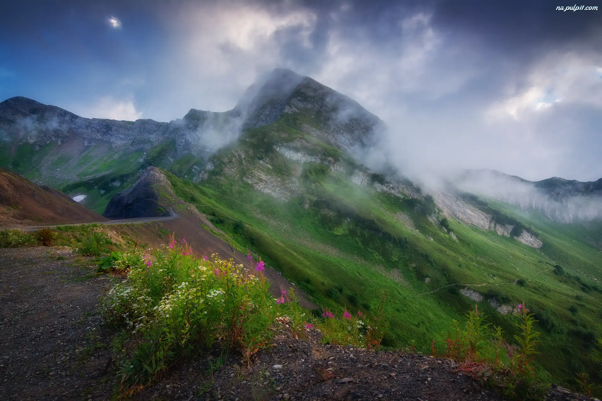 Zbocze, Aibga Ridge, Kaukaz, Chmury, Kraj Krasnodarski, Rosja, Droga, Góry, Kwiaty Na Pulpit