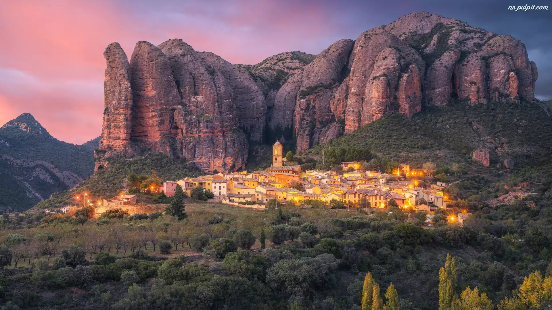 Domy, Góry, Zachód słońca, Drzewa, Aguero, Mallos de Riglos, Skały, Wzgórze, Hiszpania, Lasy, Chmury Na Pulpit |