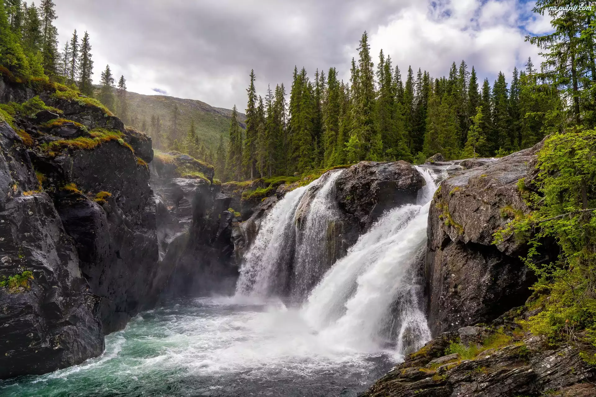 Skały, Wodospad, Las, Norwegia, Chmury, Drzewa, Hemsedal, Rjukandefossen