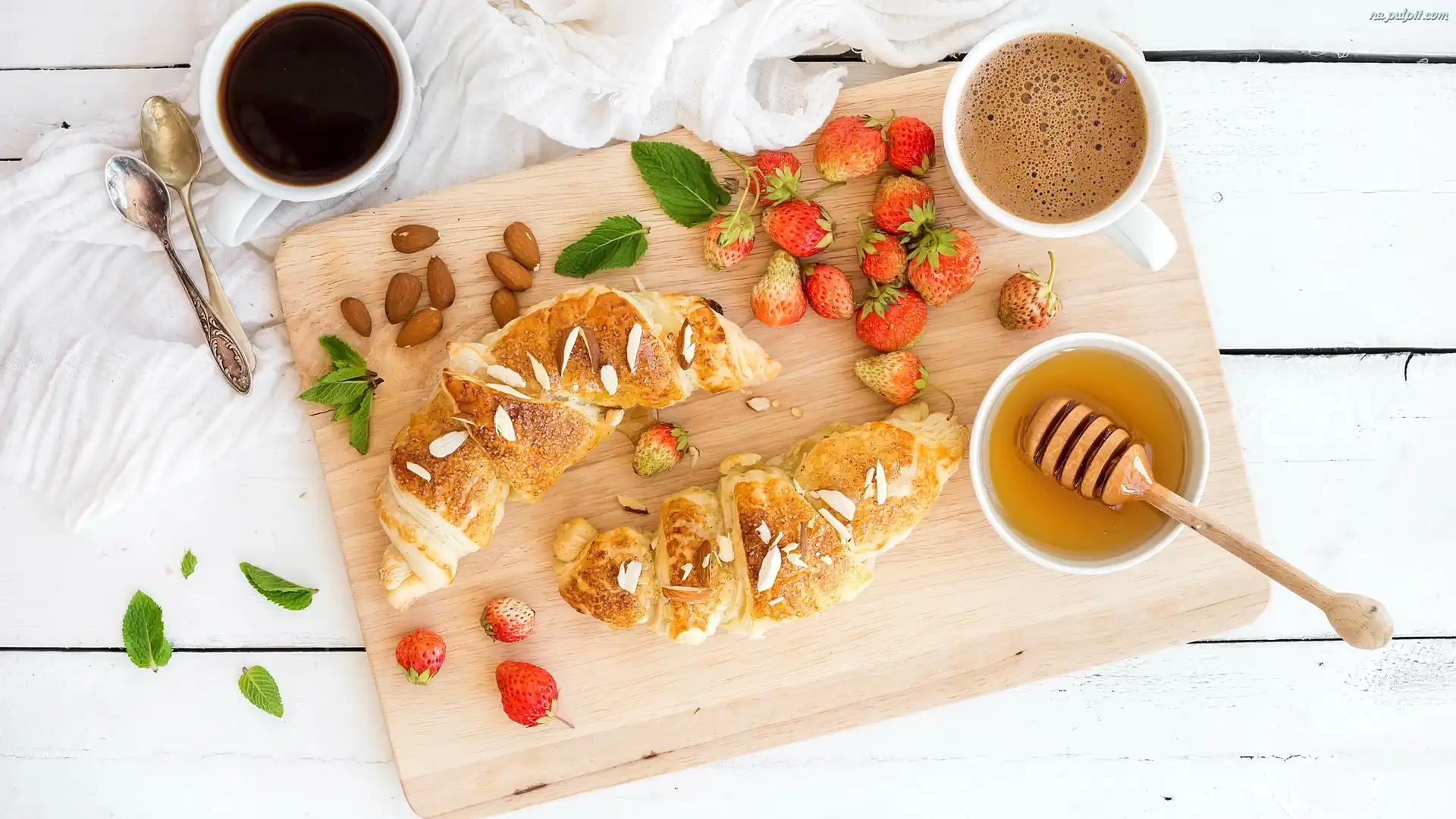 Rogaliki, Miód, Deska, Truskawki, Kawa, Migdały Na Pulpit