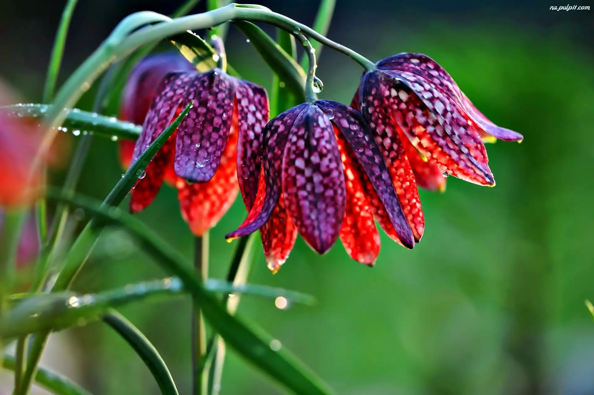 Pochylony, Szachownica kostkowata, Kwiat Szachownica kostkowata, Światło Rozmycie, Szachownica kostkowata, Kwiat, Trawa Rosa, Światło, Szachownica Kostkowata, Krople