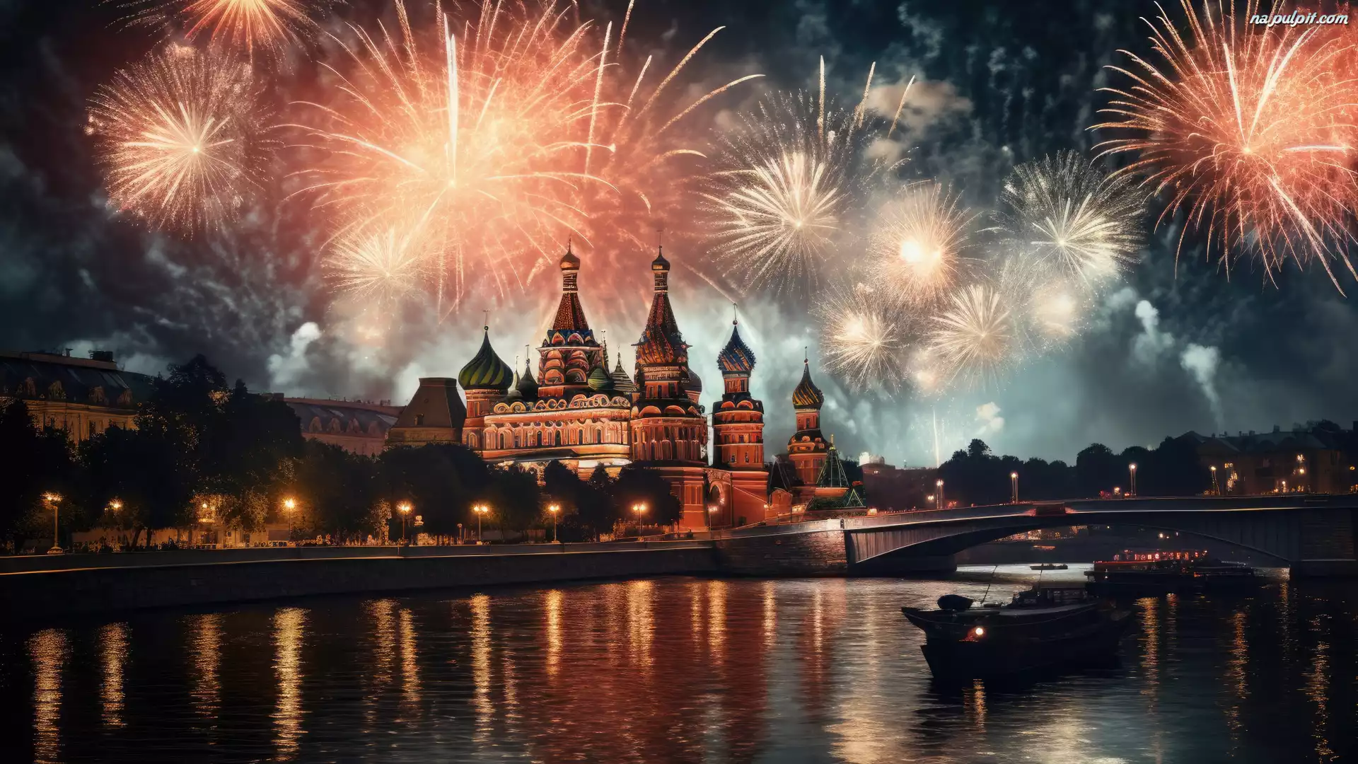 Fajerwerki, Sobór Wasyla Błogosławionego, Rzeka, Sylwester, Rosja, Moskwa, Nowy Rok, Cerkiew Na Pulpit |