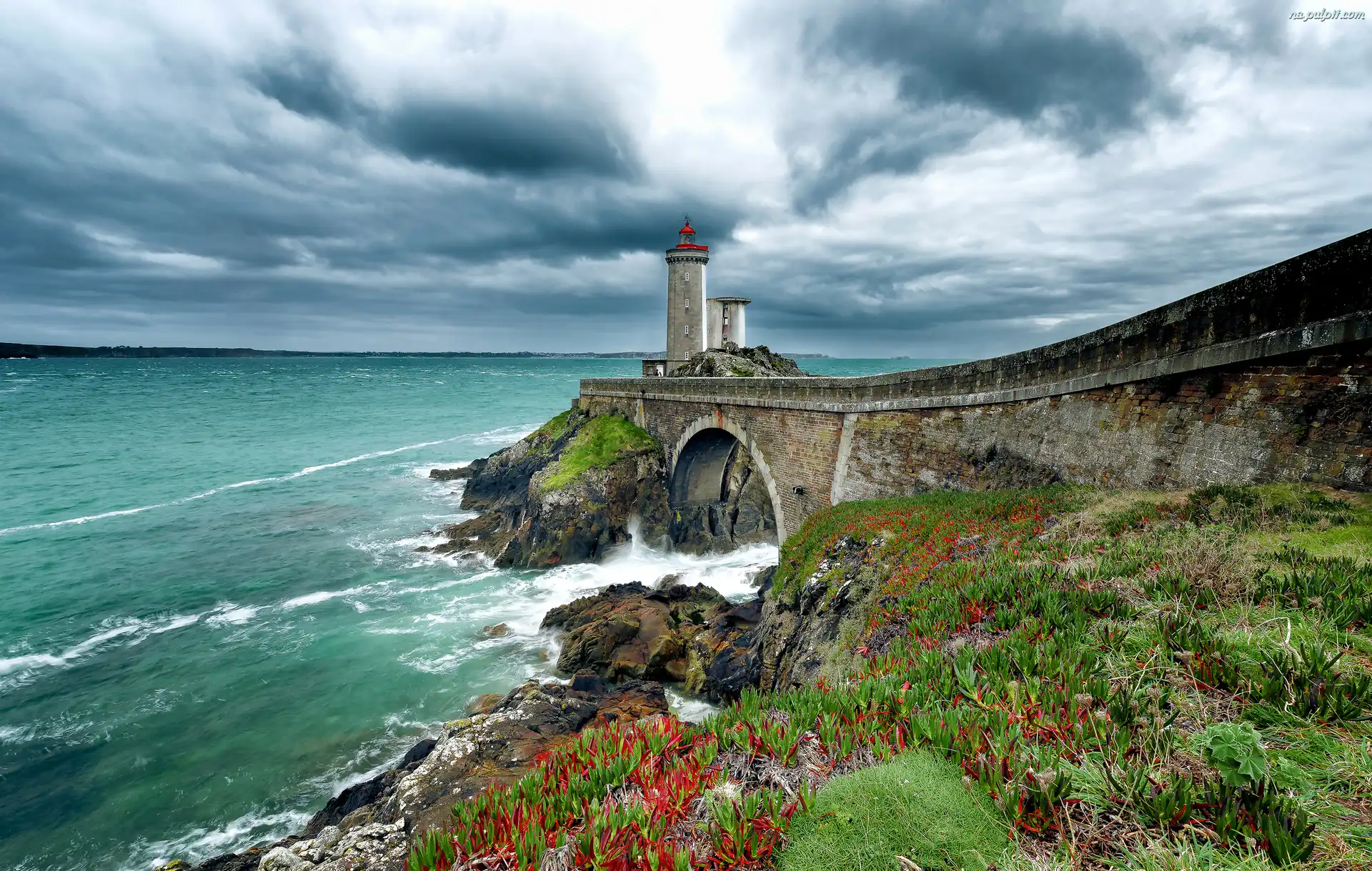 Roślinność, Bretania, Wybrzeże, Latarnia morska Phare du Petit Minou, Gmina Plouzané, Francja, Morze Na Pulpit |