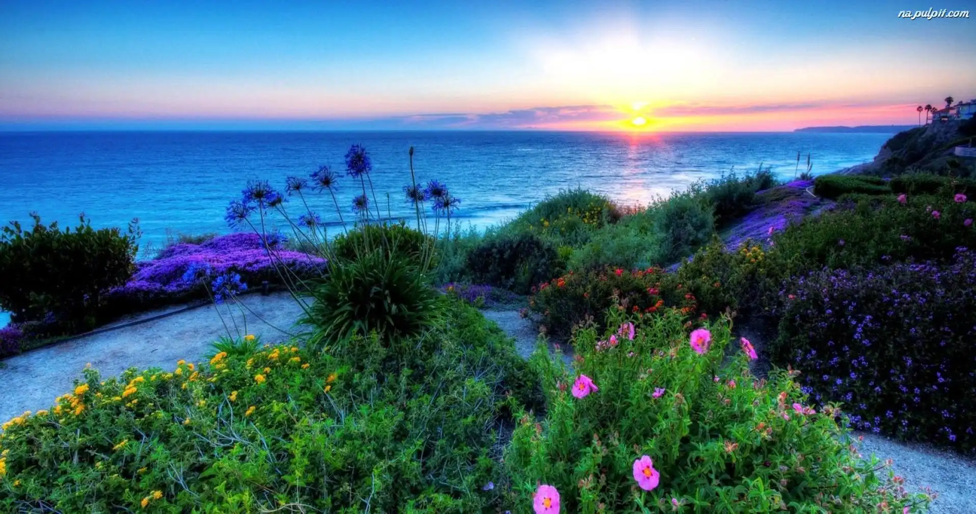 Roślinność, Zachód Słońca, Morze, Kwiaty Na Pulpit