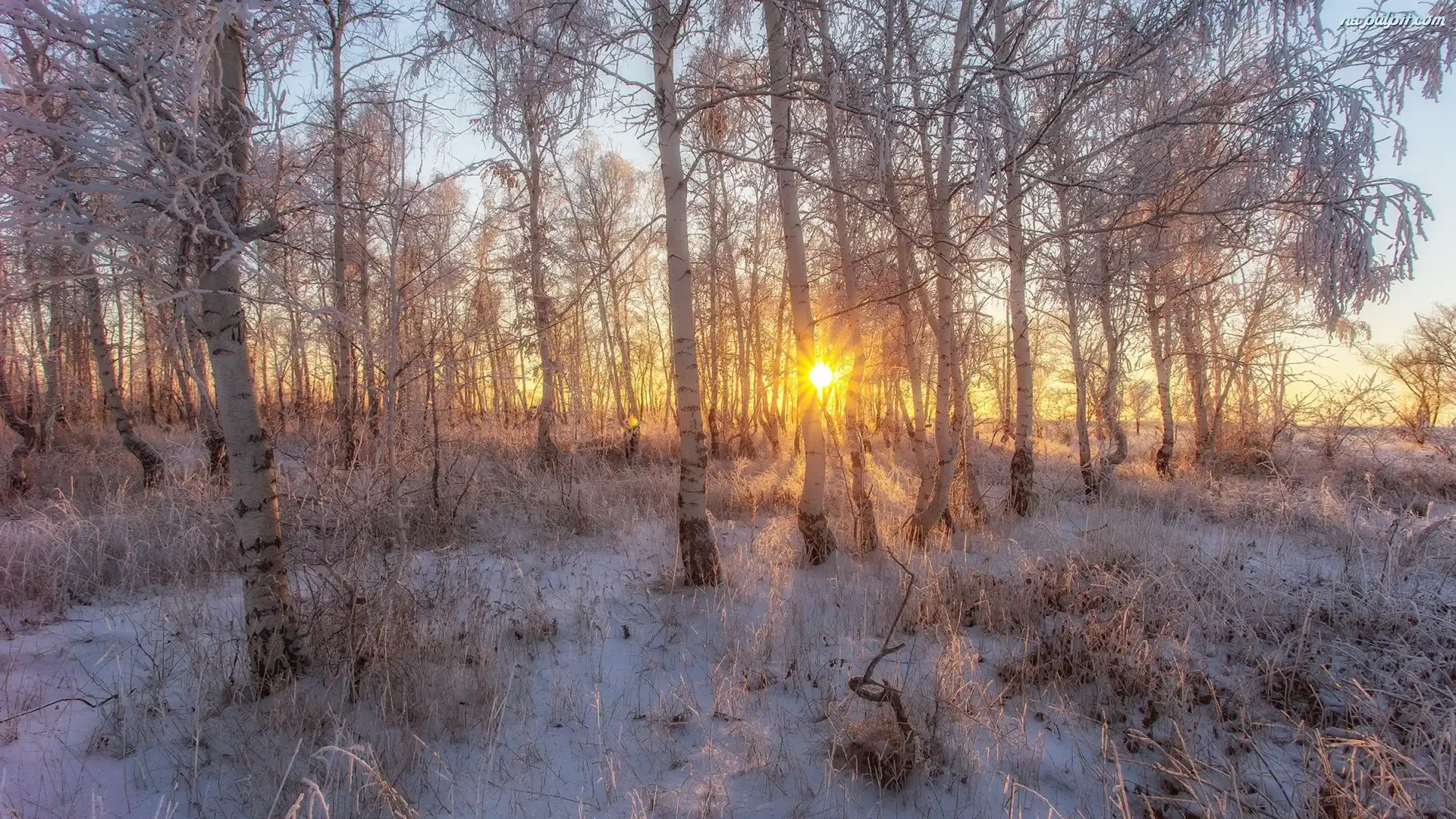 Las, Rośliny, Promienie słońca, Drzewa, Zima, Brzozy Na Pulpit