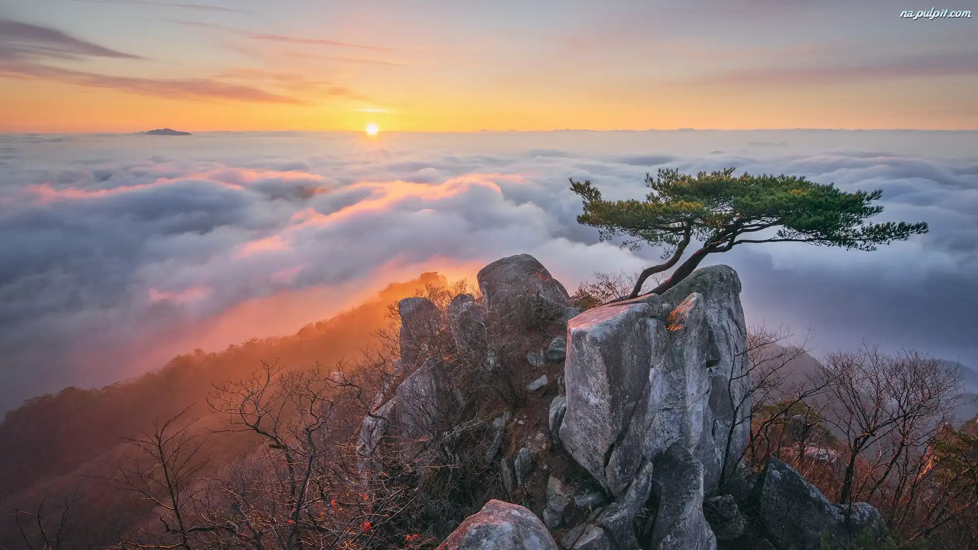 Drzewo, Góry, Mgła, Sosna, Skały, Chmury, Wschód słońca, Rośliny Na Pulpit