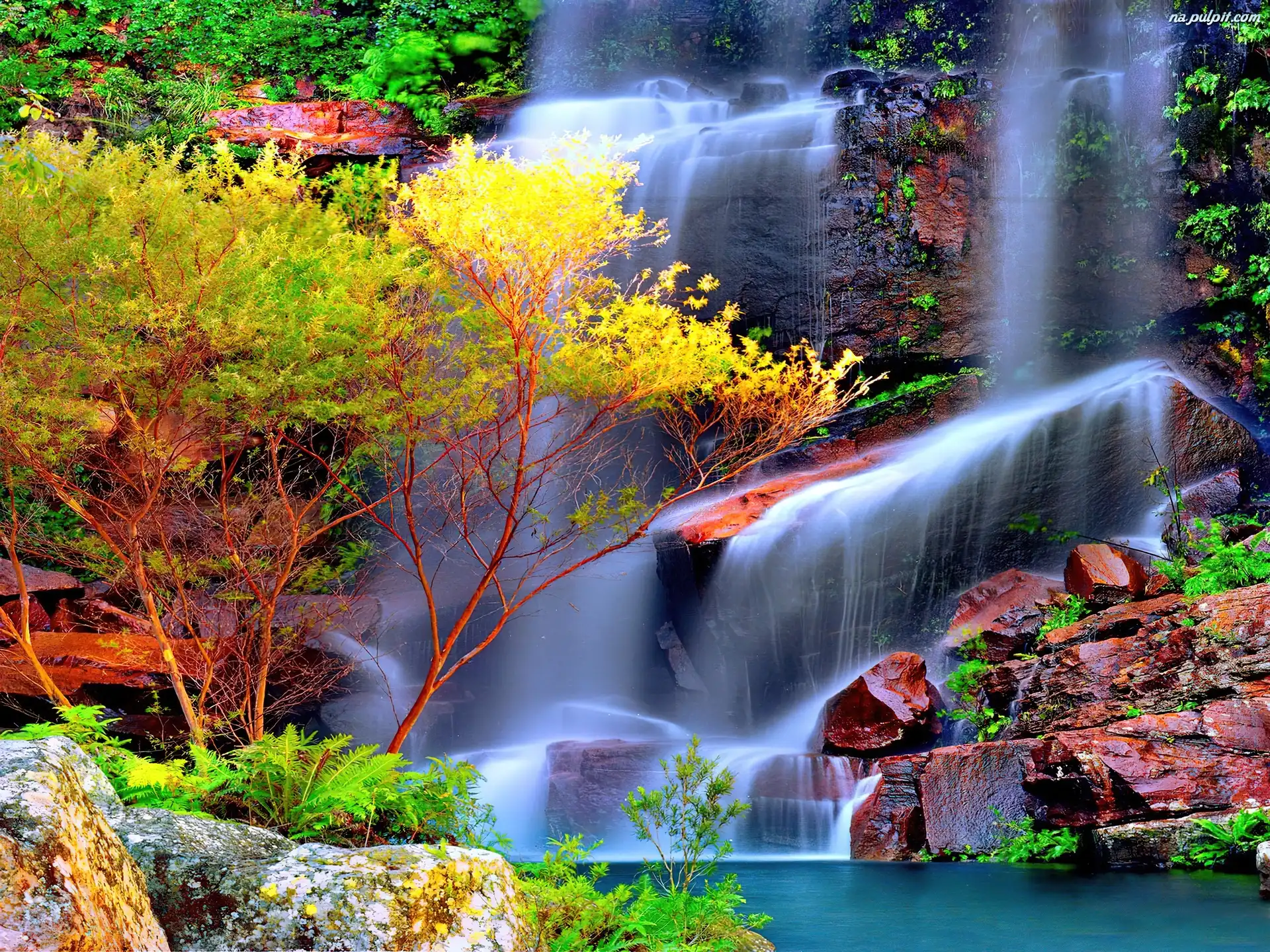 Rośliny, Skały, Wodospad, Kolorowe