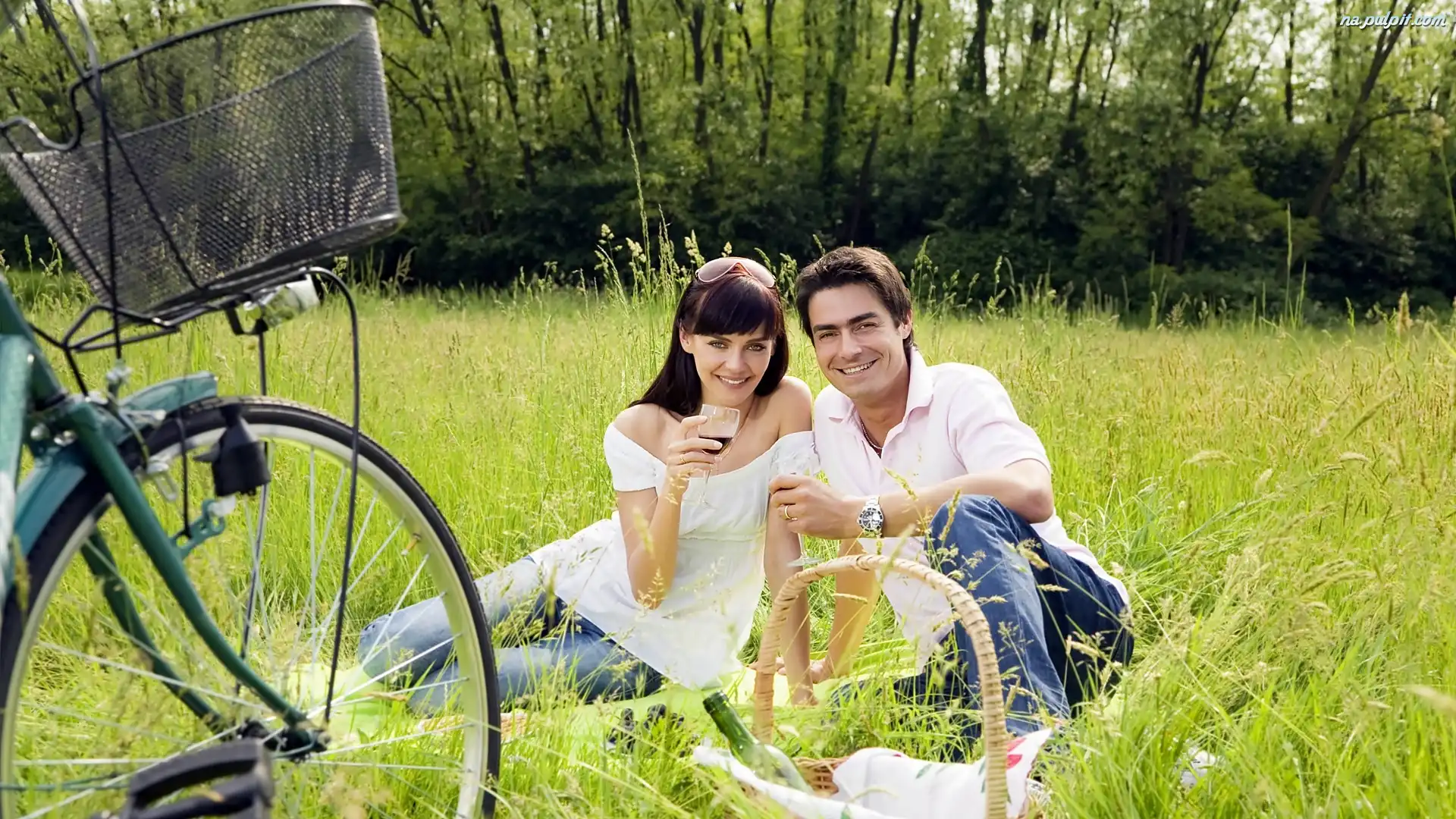 Rower, Piknik, Mężczyzna, Kobieta, Łąka Na Pulpit
