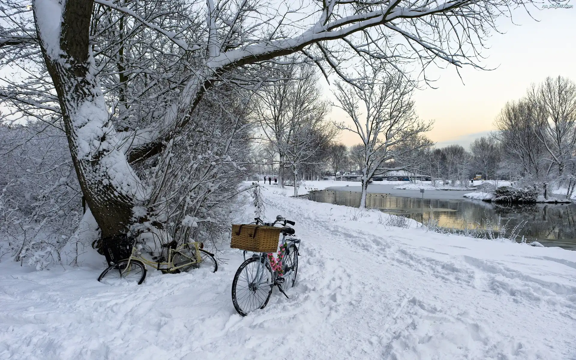 Rowery, Śnieg, Park, Rzeka Na Pulpit