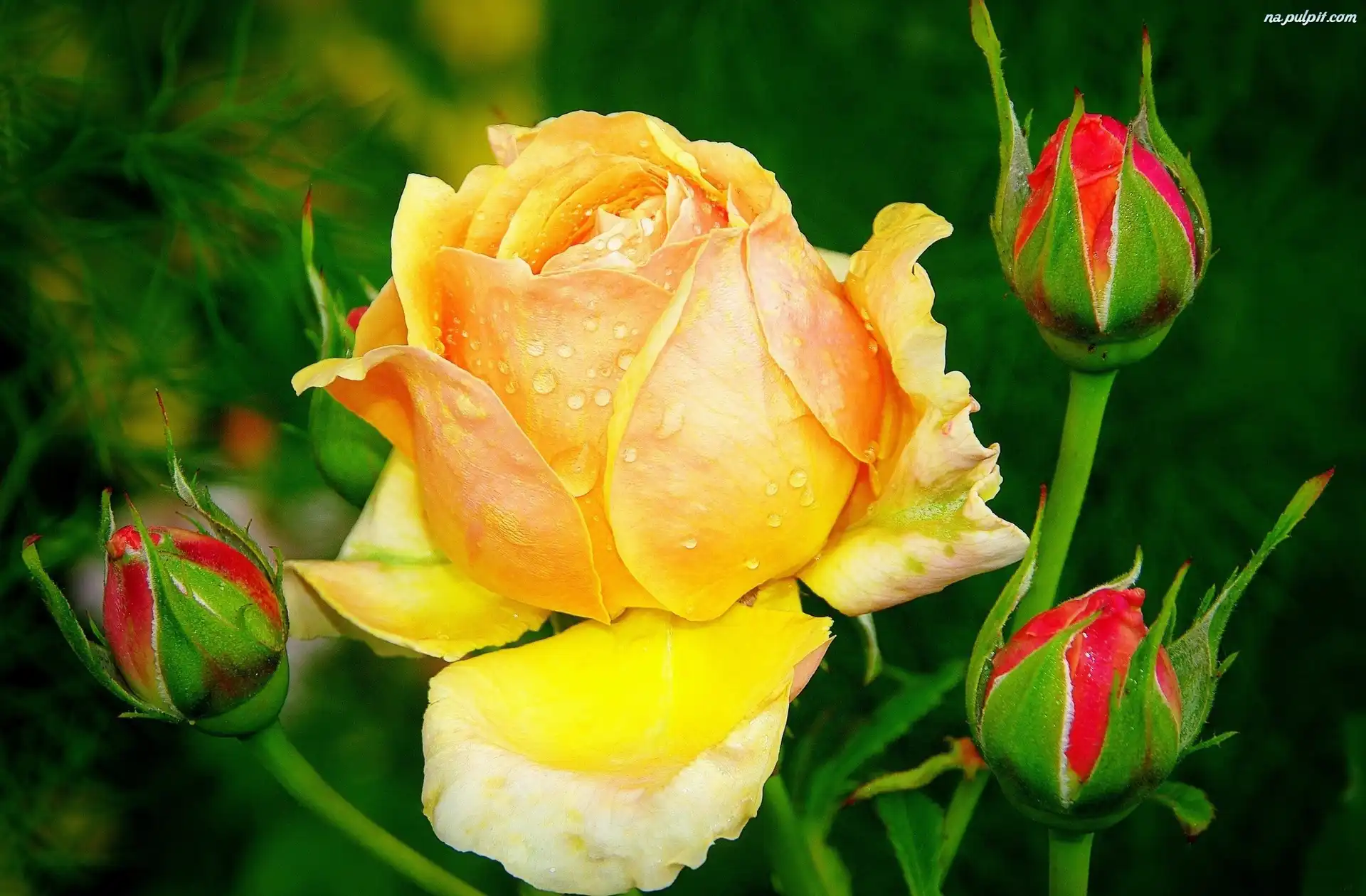 Róża, Krople, Wody, Czerwone, Żółta, Pączki