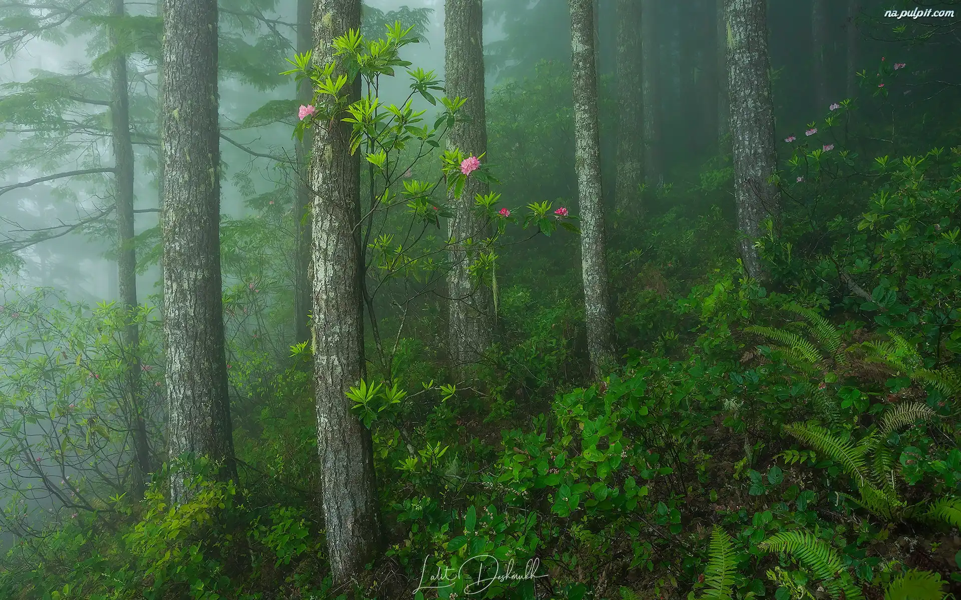 Mgła, Las, Kwiaty, Różanecznik, Drzewa, Paprocie Na Pulpit