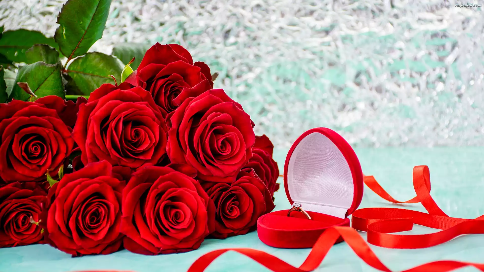 Róże, Pudełko, Wstążka, Bukiet, Czerwone, Pierścionek Na Pulpit