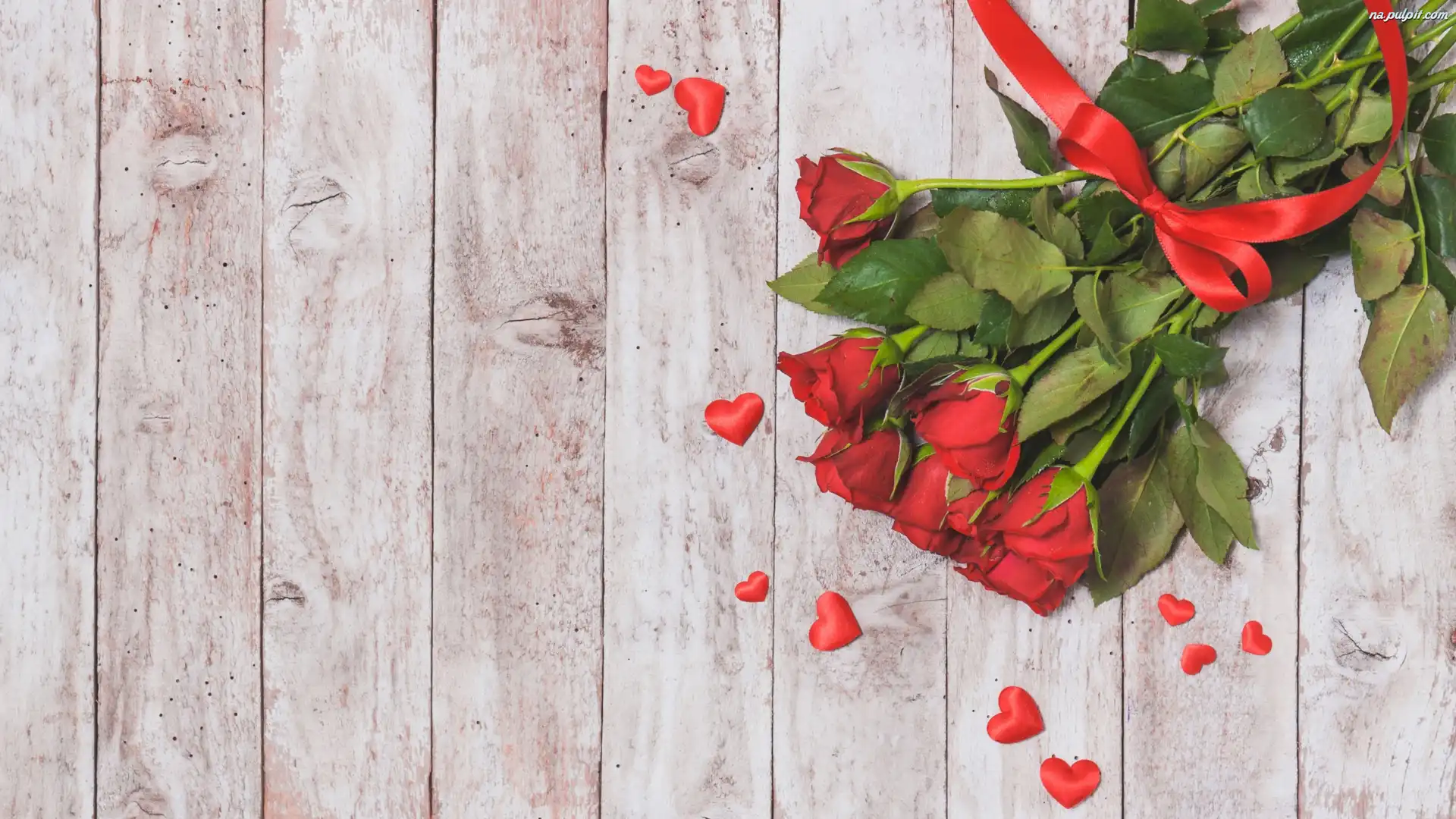 Deski, Róże, Serduszka, Bukiet, Czerwone, Walentynki, Wstążka
