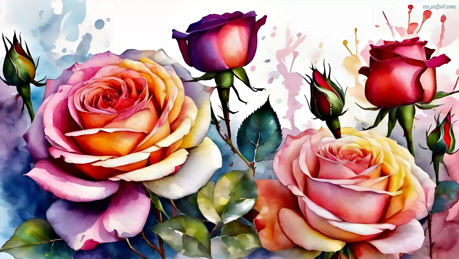 Akwarela, Róże, Kolorowe, Grafika, Kwiaty Na Pulpit