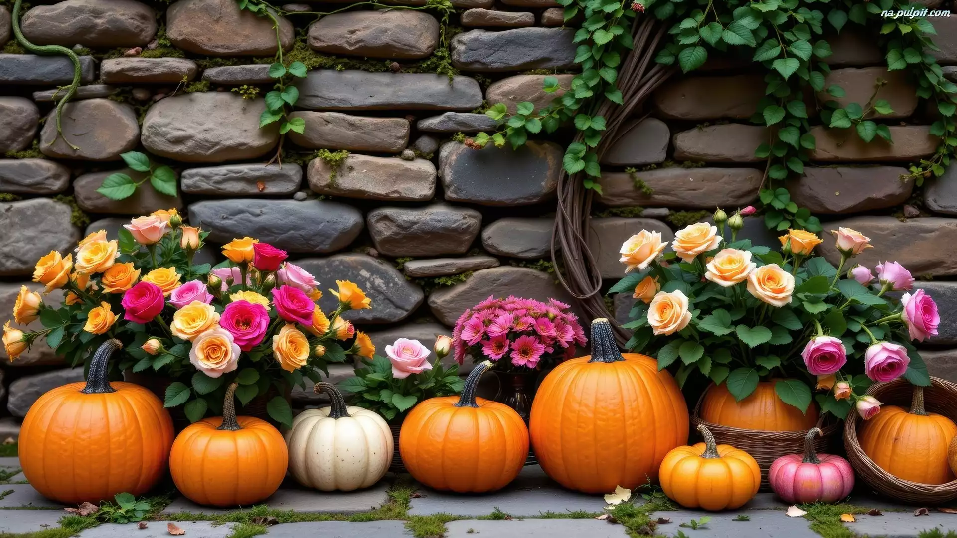 Kamienny, Dynie, Kwiaty, Róże, Kolorowe, Mur Na Pulpit