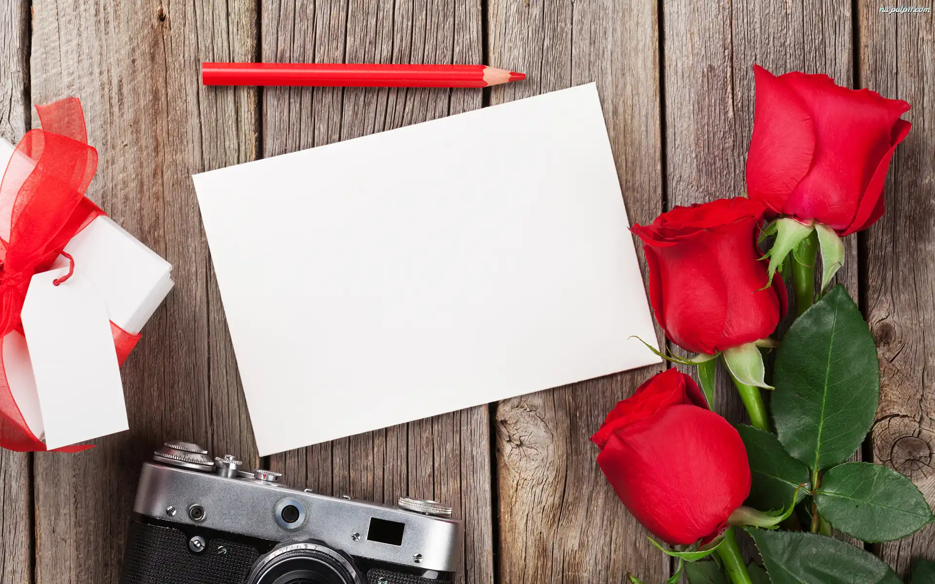 Deski, Róże, Aparat fotograficzny, Kredka, Kartka, Kwiaty, Prezent Na Pulpit