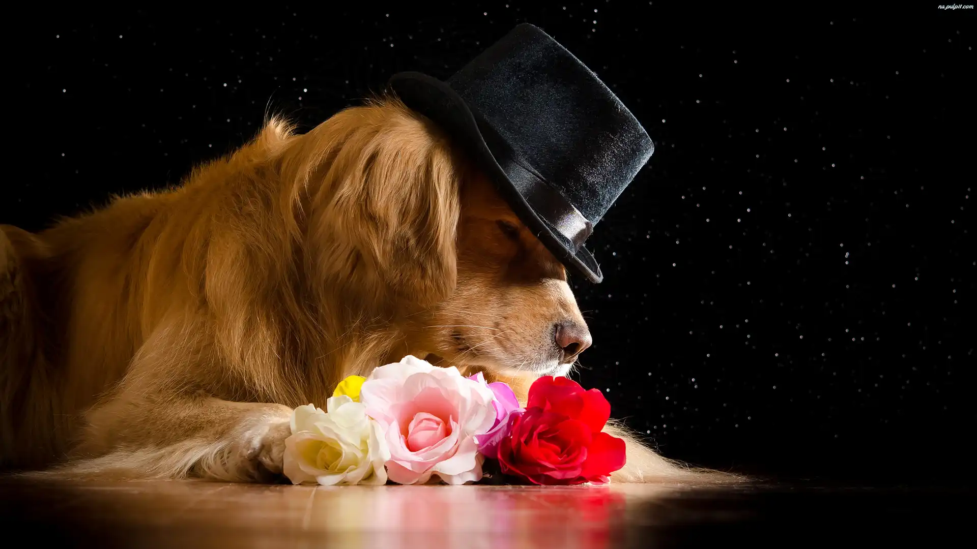 Róże, Golden retriever, Kapelusz Na Pulpit