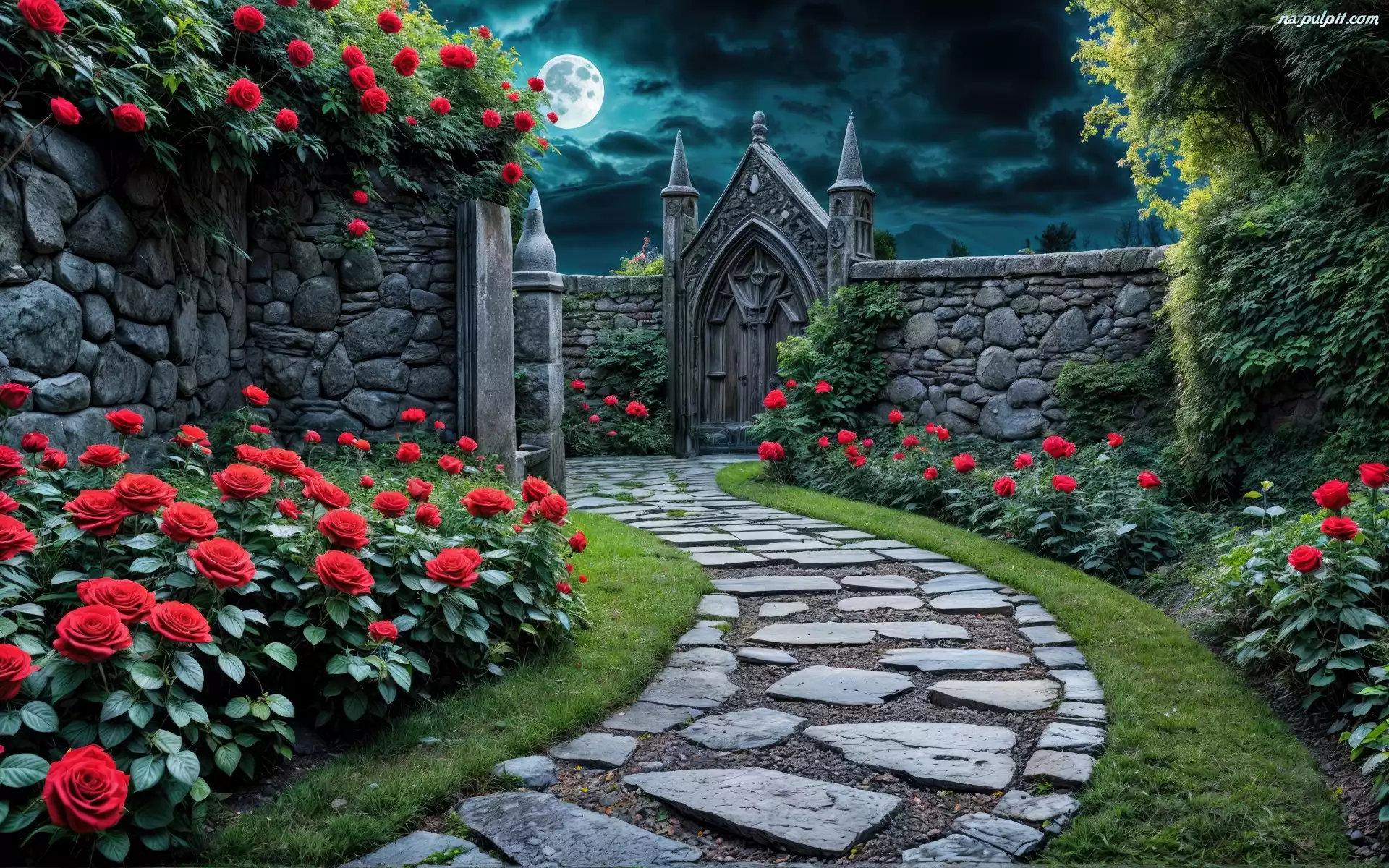 Księżyc, Róże, Ścieżka, Grafika, Mur Na Pulpit