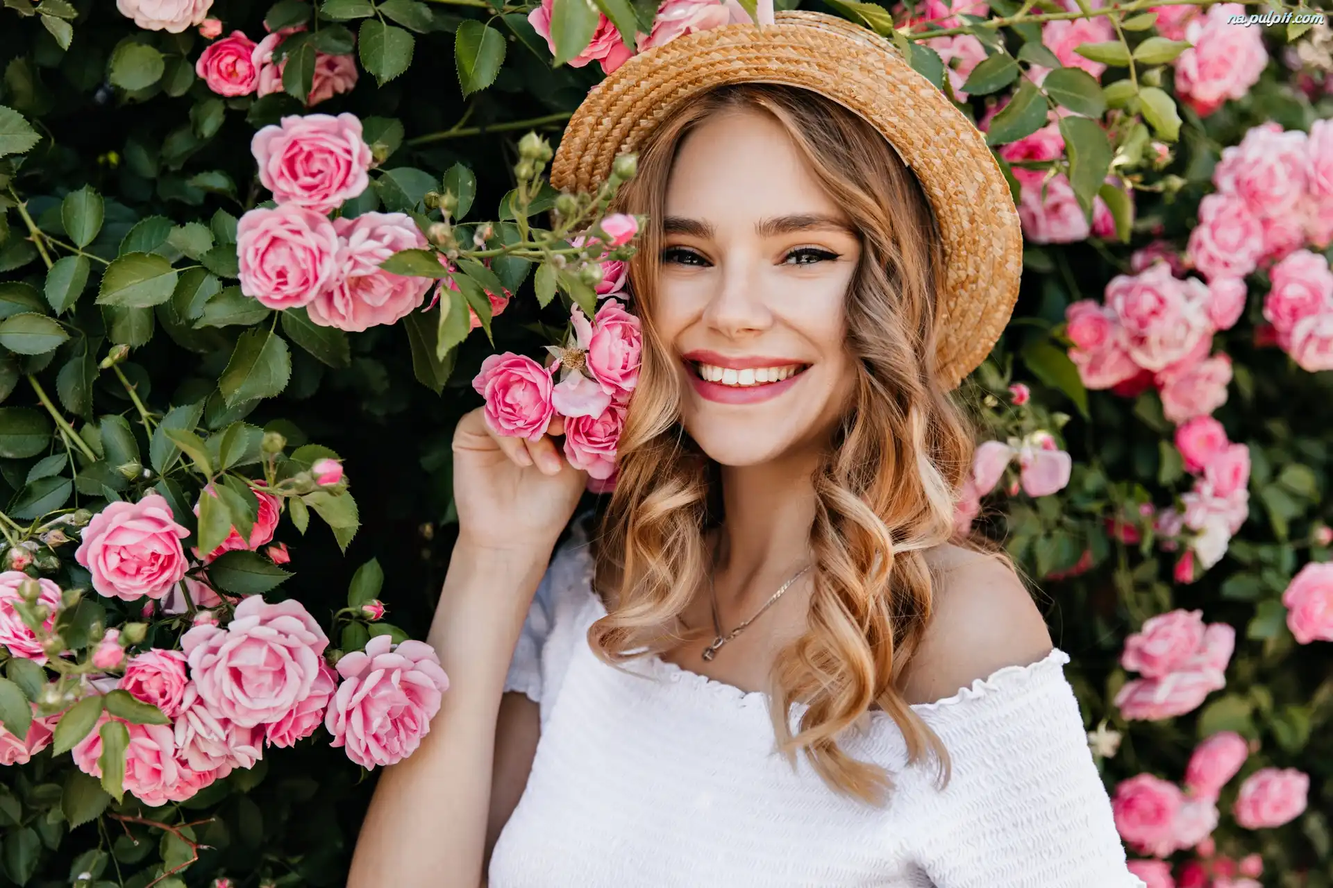 Róże, Kobieta, Uśmiechnięta, Kapelusz