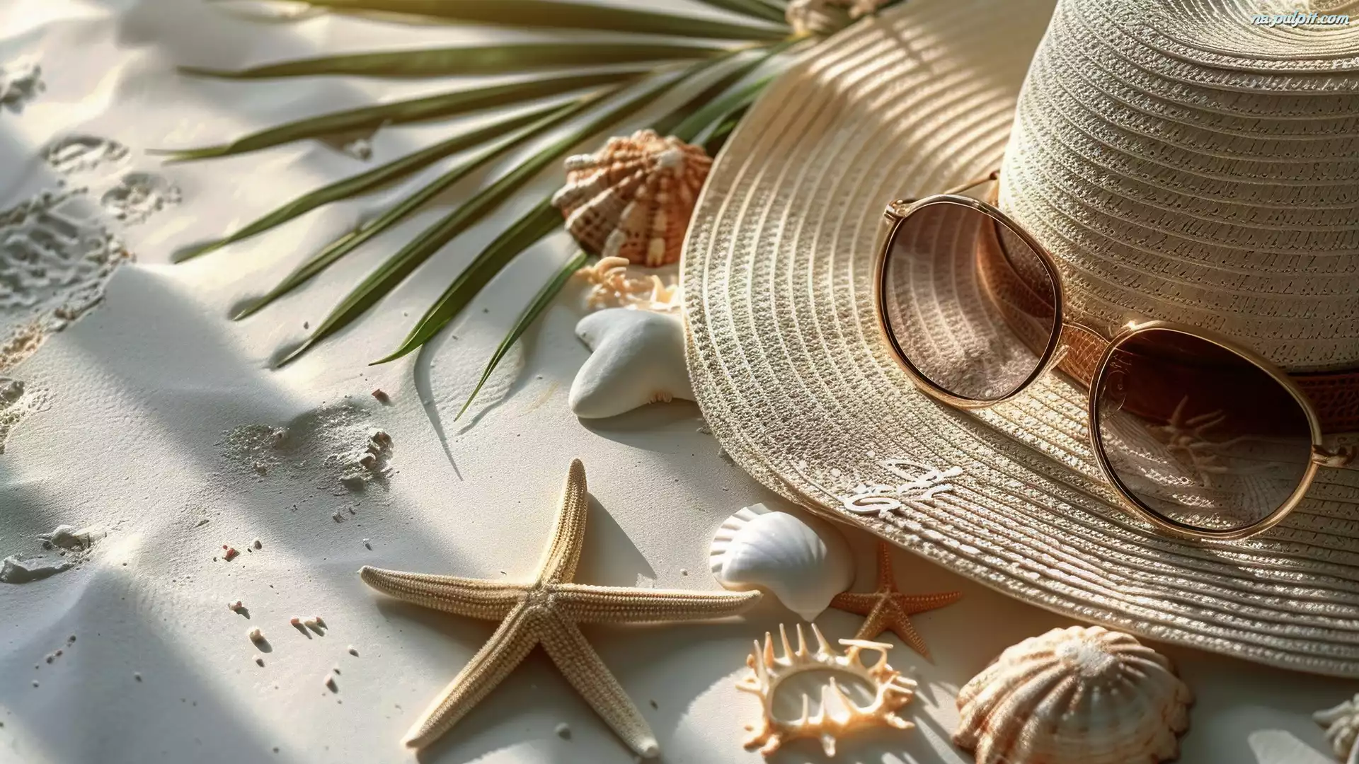 Muszelki, Piasek, Okulary, Rozgwiazdy, Kapelusz, Roślina