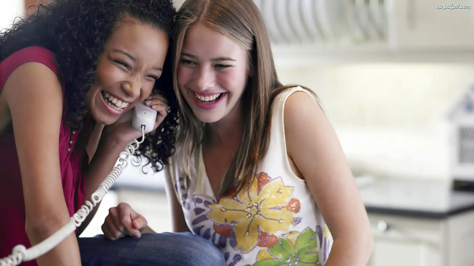 Rozmowa, Kobiety, Uśmiechnięte, Dwie, Telefon