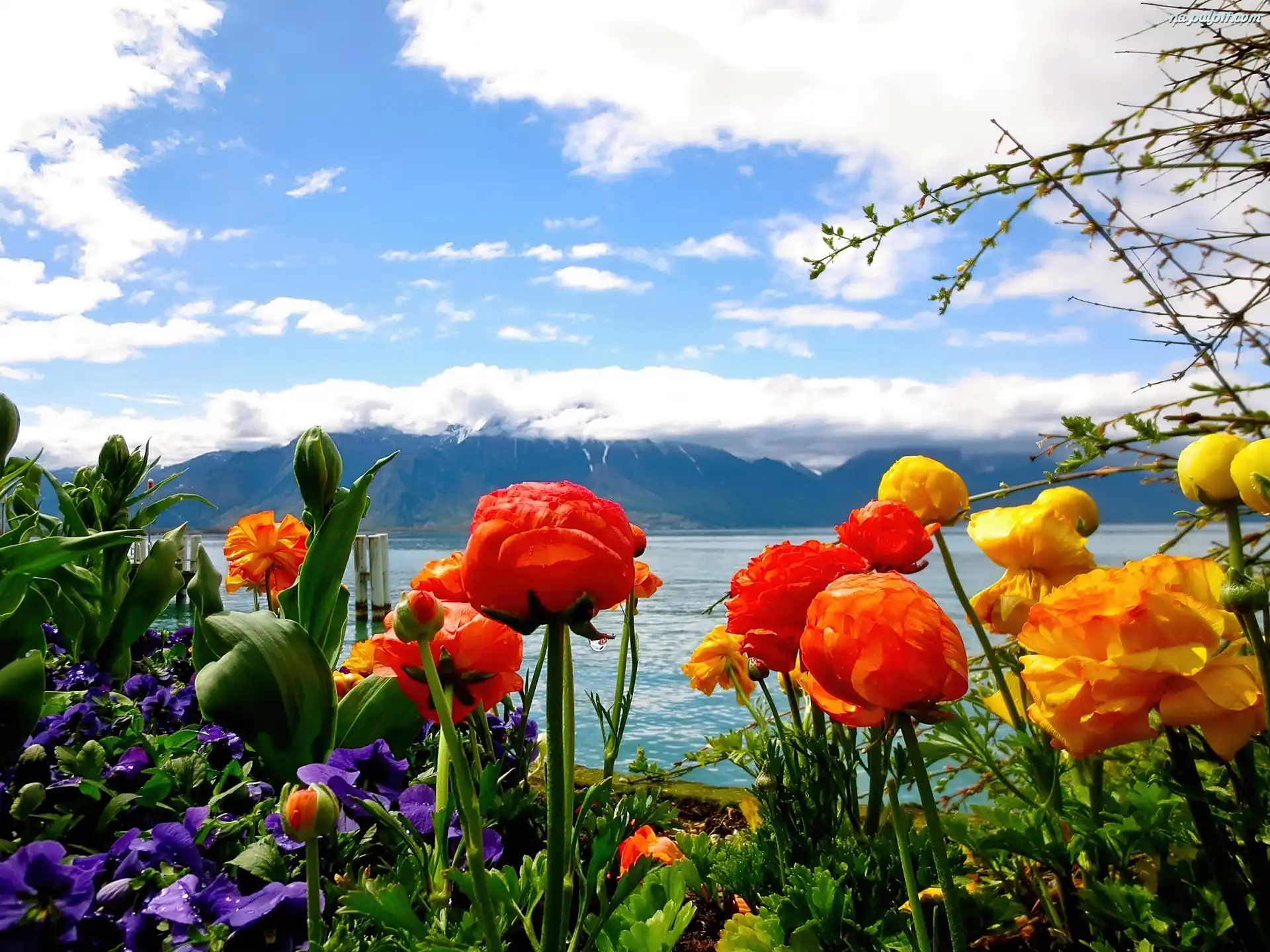 Rozmycie, Rzeka, Kwiaty, Obłoki