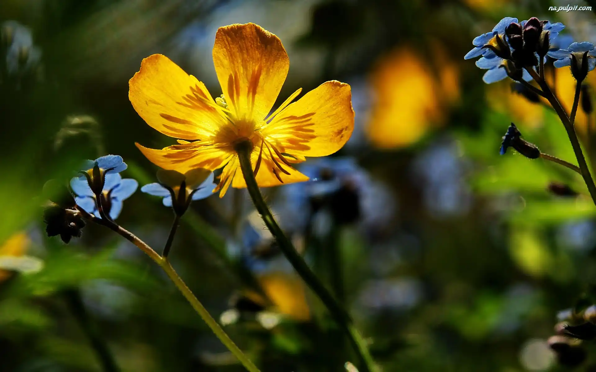 Rozmycie, Niebieskie, Żółte, Kwiaty