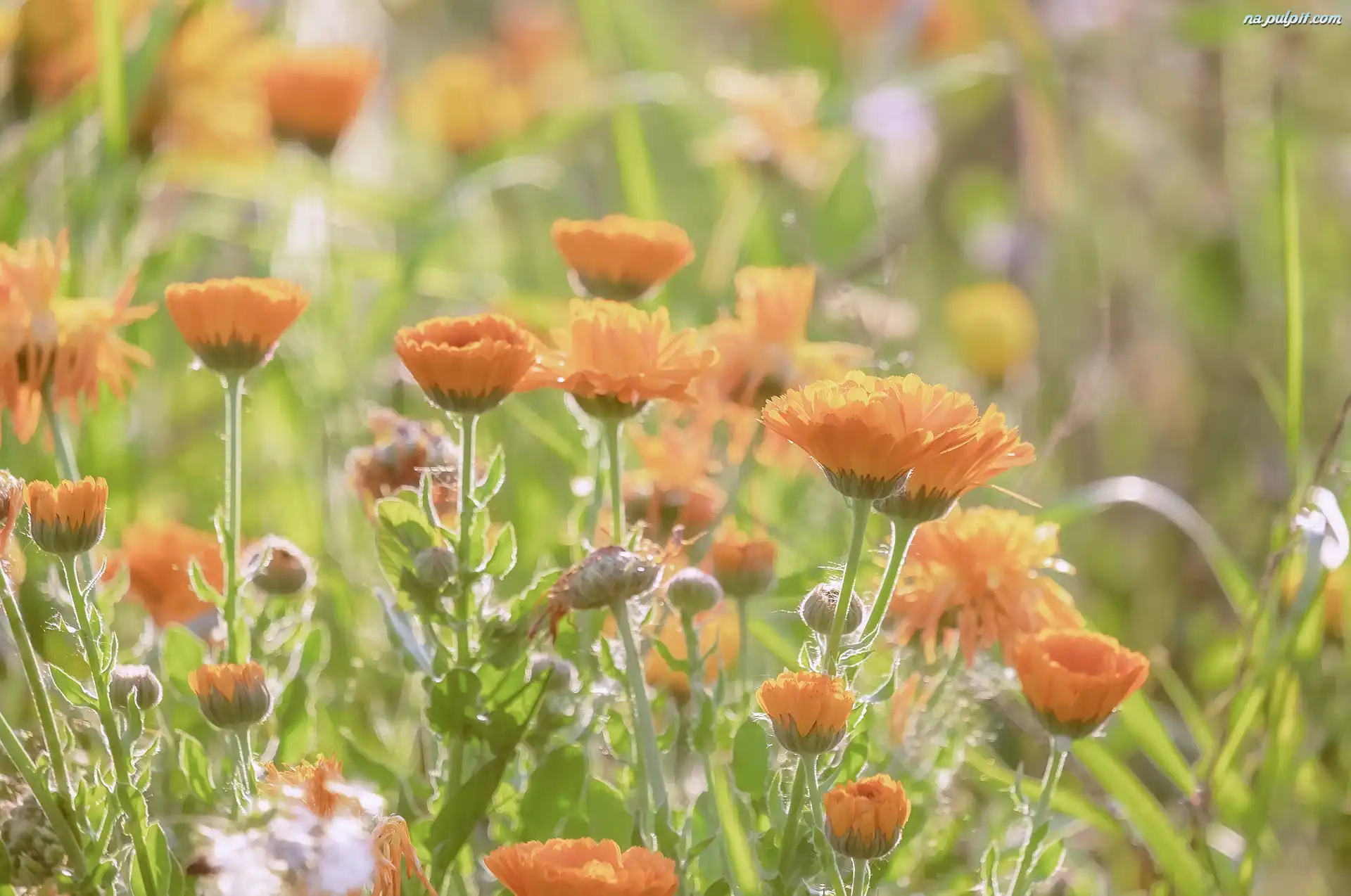 Rozmyte tło, Nagietki, Kwiaty, Pomarańczowe, Łąka Na Pulpit