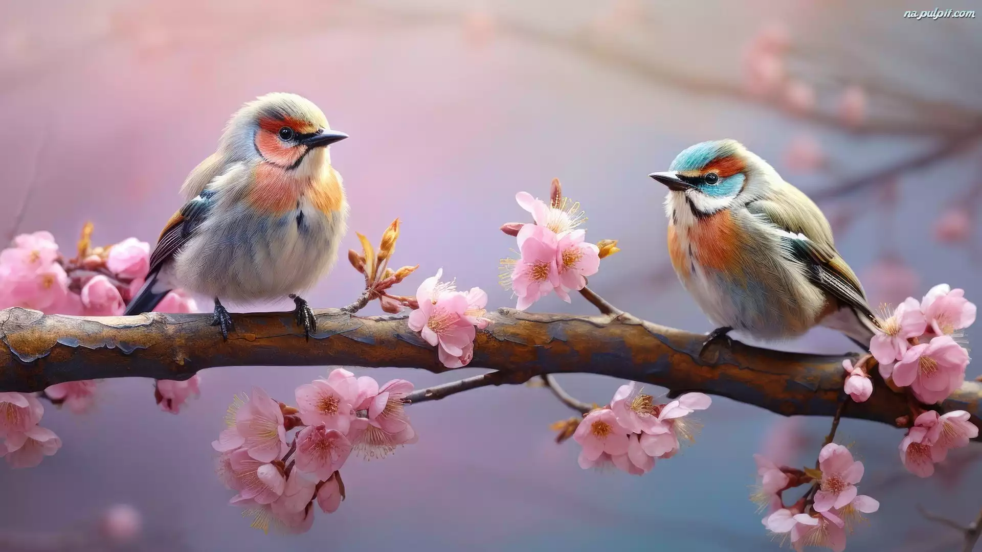 Kwiaty, Dwa, Gałąź, Różowe, Ptaki, Grafika Na Pulpit