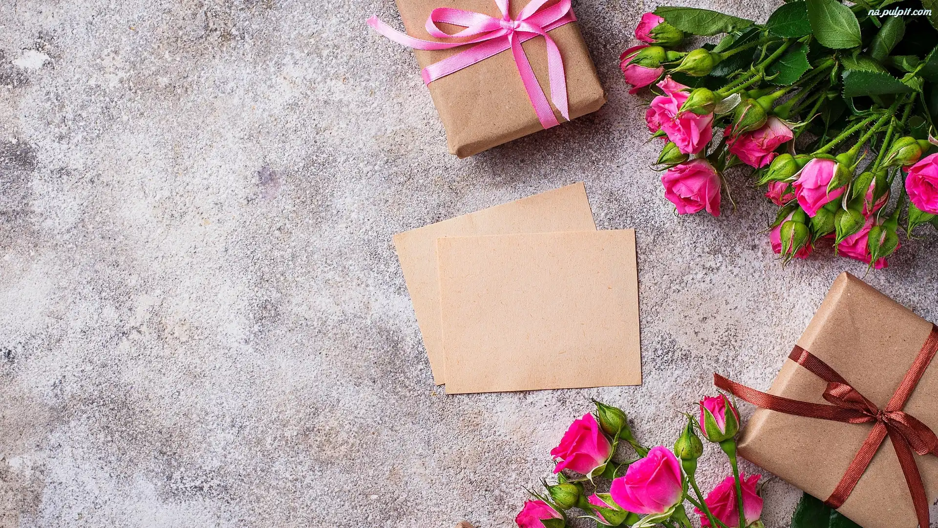 Kartki, Różowe, Prezenty, Pąki, Róże, Kwiaty, Bukiety