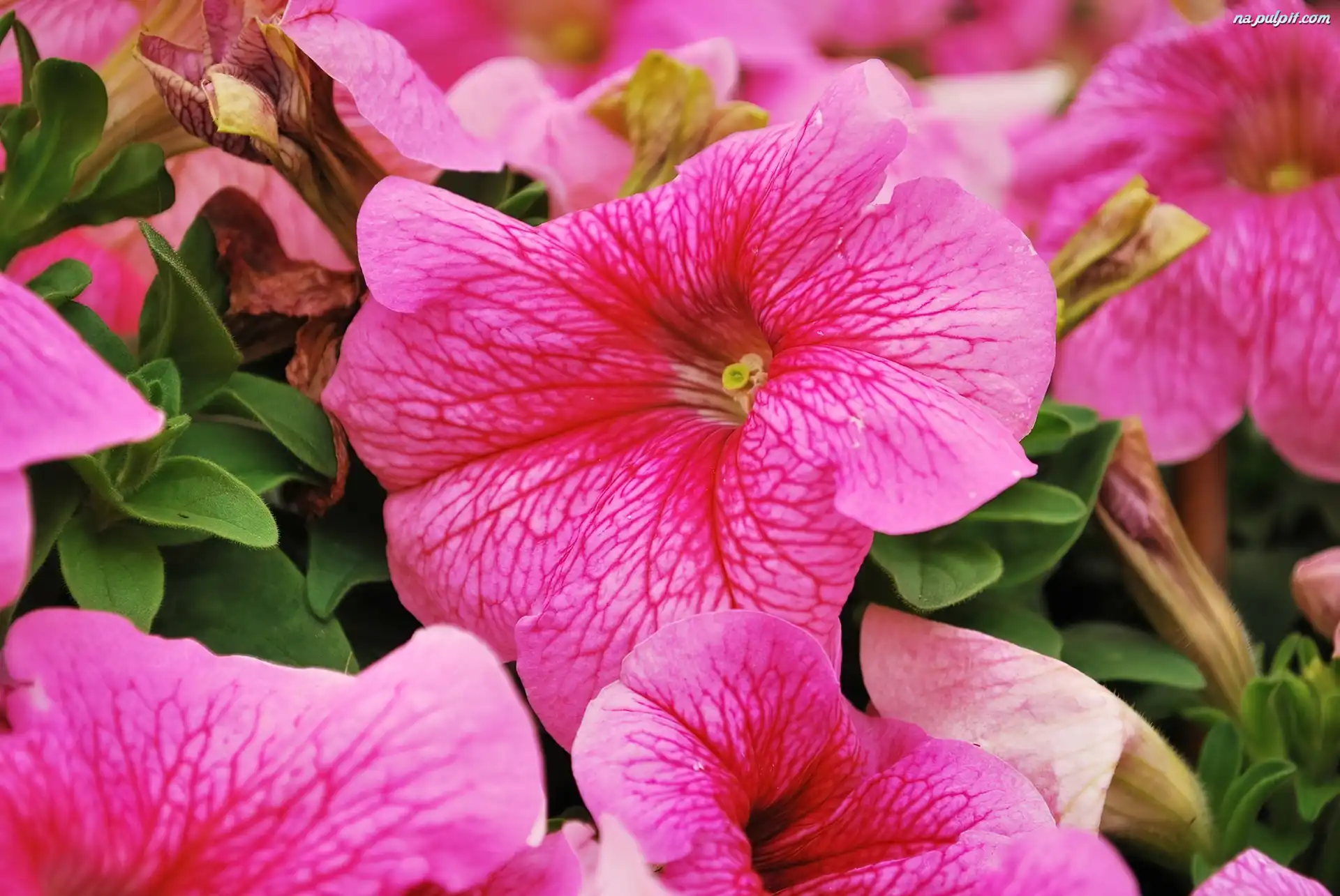 Petunie, Kwiaty, Grafika, Listki Różowa, Petunia ogrodowa Petunie, Różowo, Białe Petunia ogrodowa, Doniczka Fioletowe, Kwiaty, Grafika, Petunie Ogrodowa