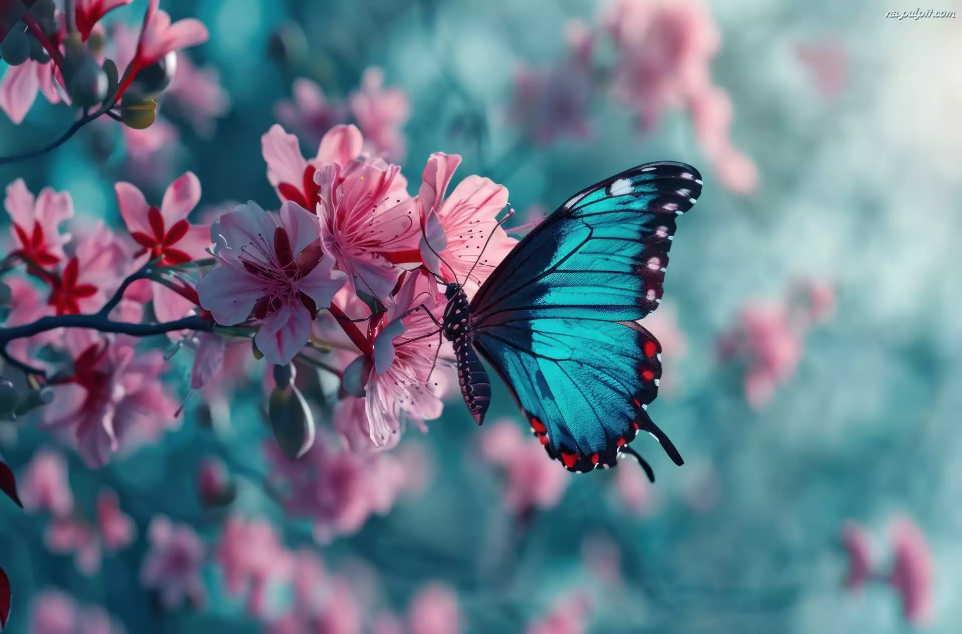 Niebieski, Różowe, Kwiaty, Motyl, Gałąź
