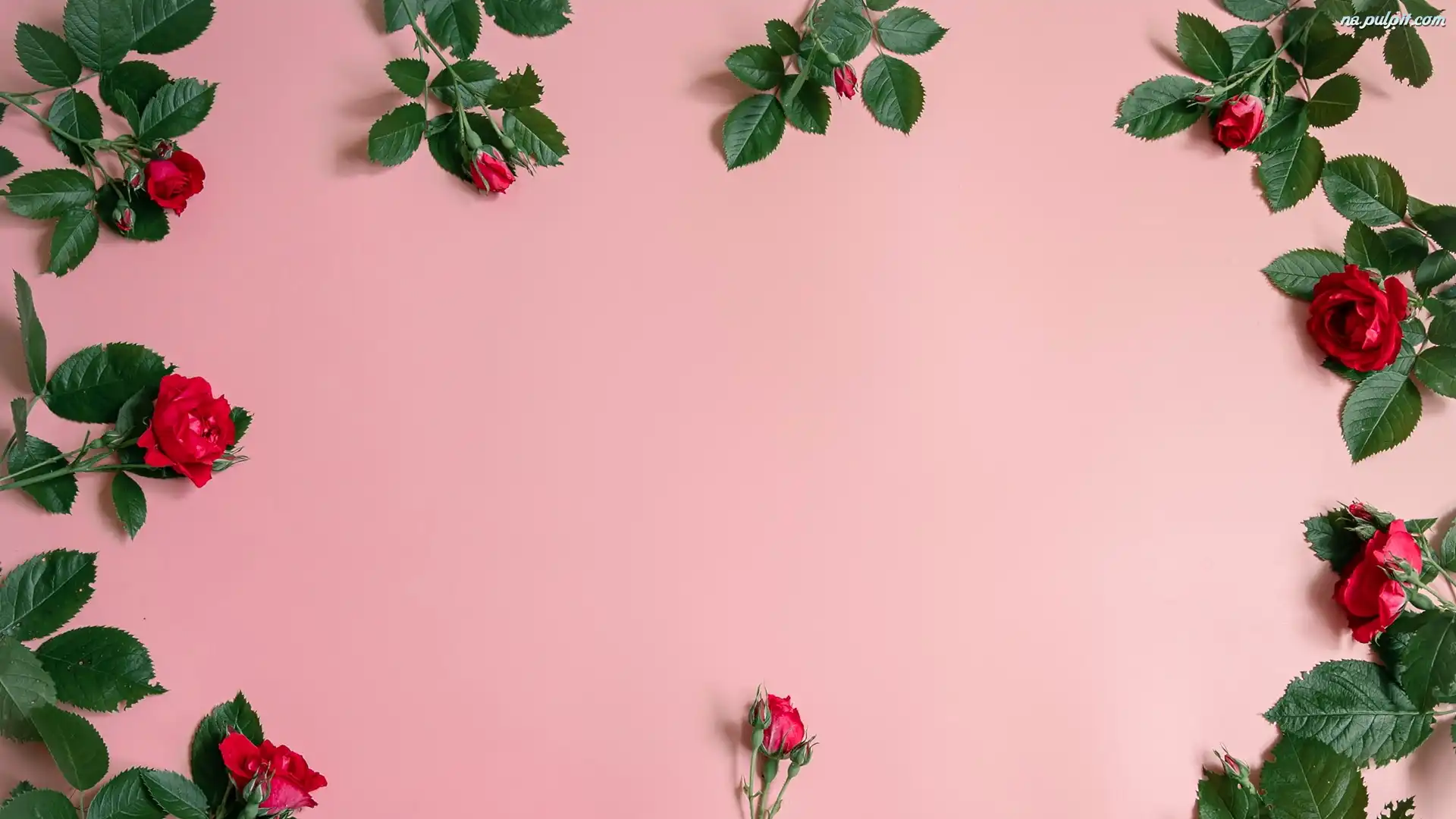 Różowe tło, Róże, Czerwone, Kwiaty, Liście Na Pulpit