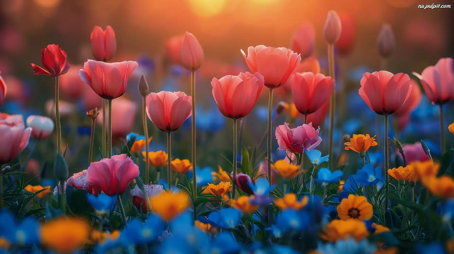 Zachód słońca, Tulipany, Różowe, Grafika, Kwiaty Na Pulpit