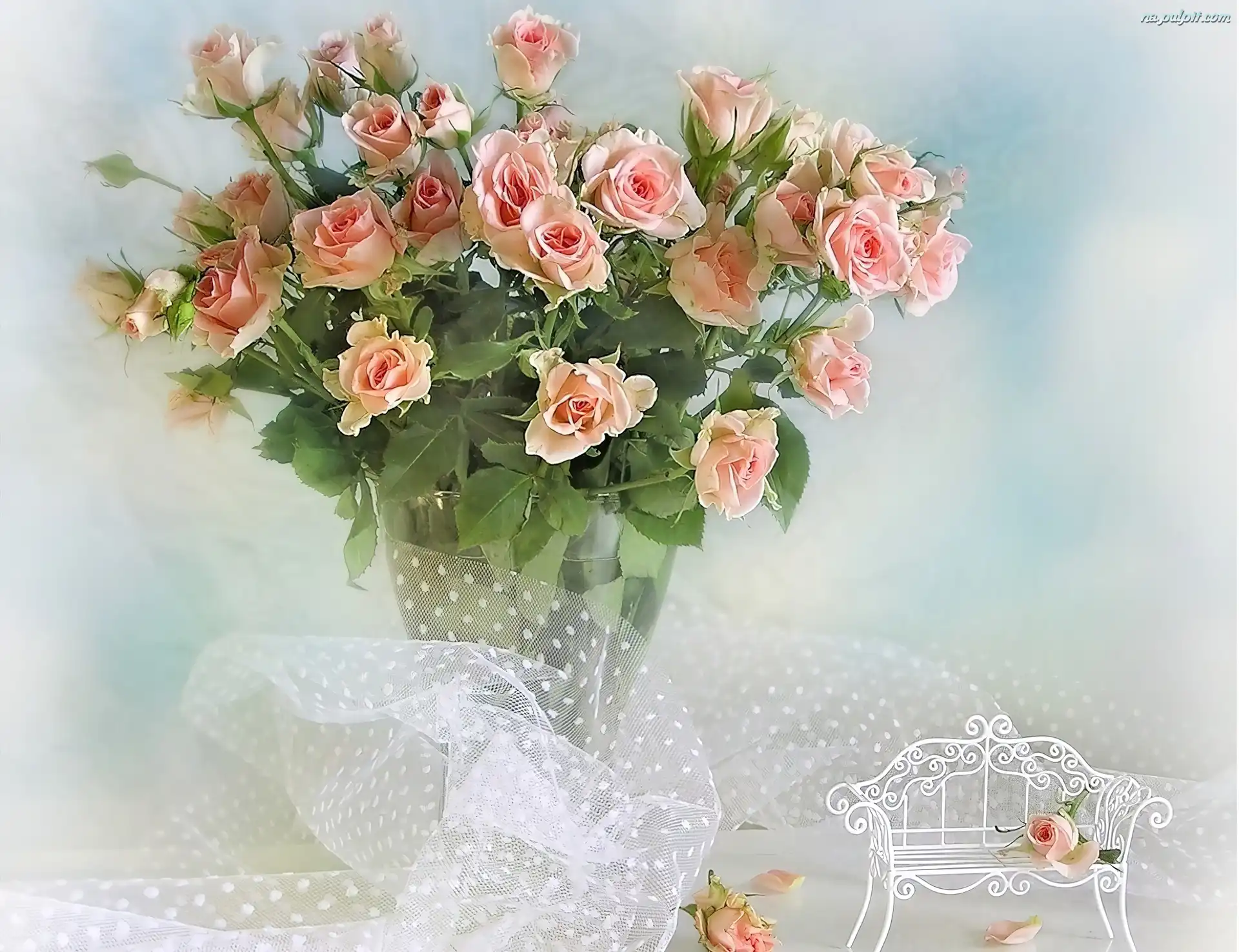 Różowe, Miniaturowa, Ławeczka, Różyczki, Maleńkie, Wazon Na Pulpit