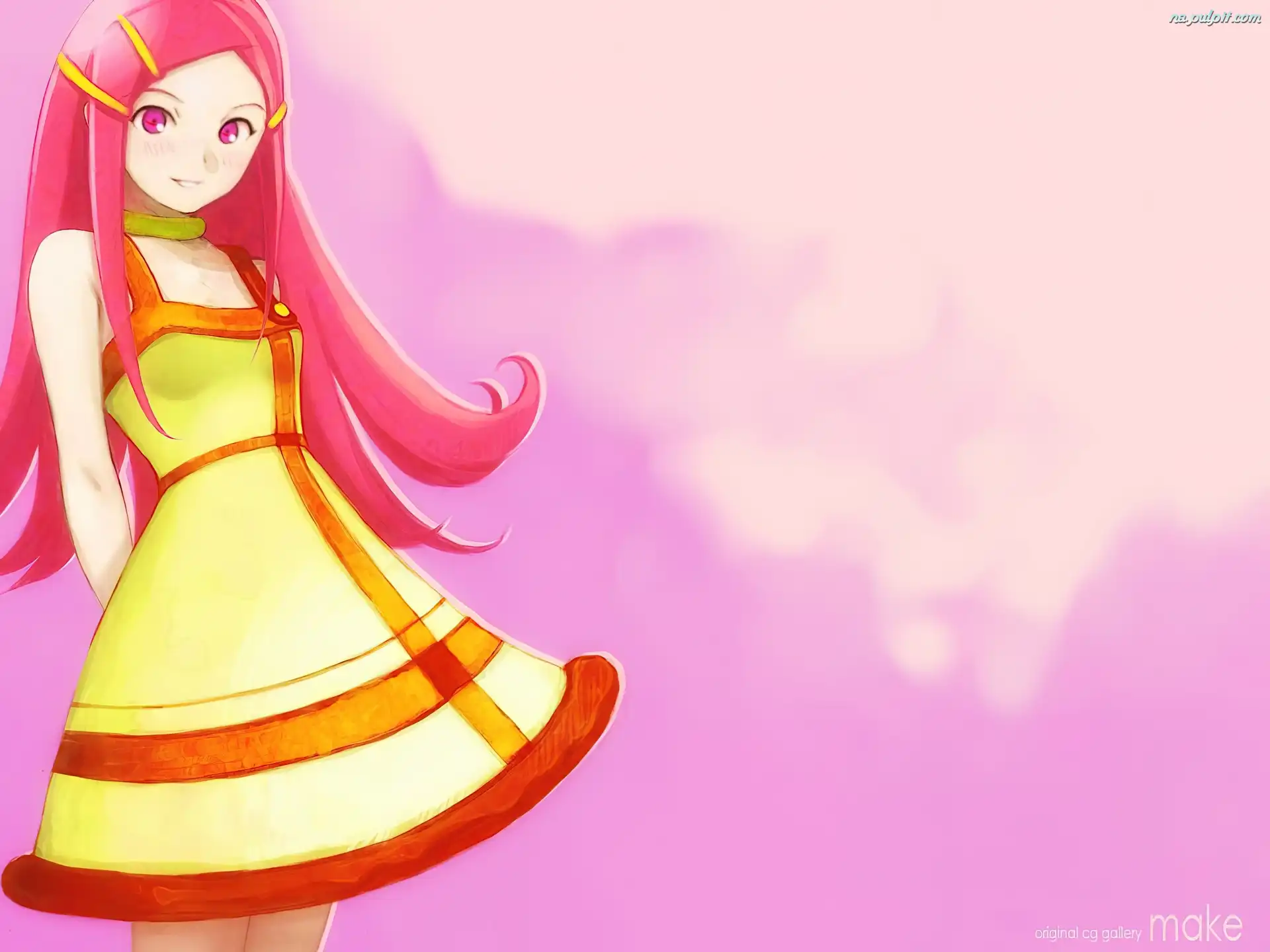 różowe włosy, Nagko, sukienka instrumenty, Nagko, dziewczyny strój w kwiaty, Nagko, warkocze zielone włosy, Nagko, sukienka liście, Nagko, świnka