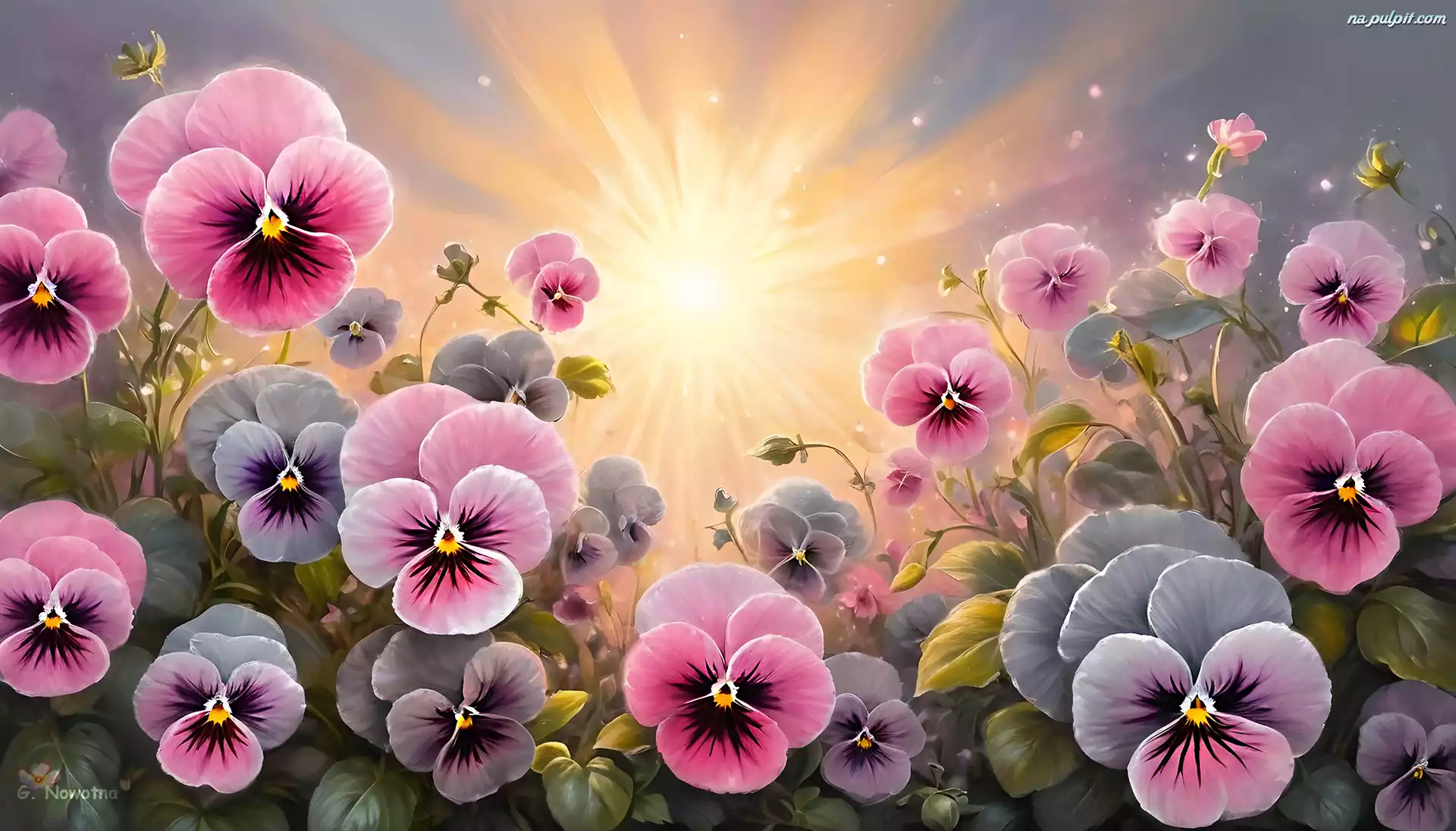 Kwiaty, Różowe, Szare, Grafika, Bratki Na Pulpit