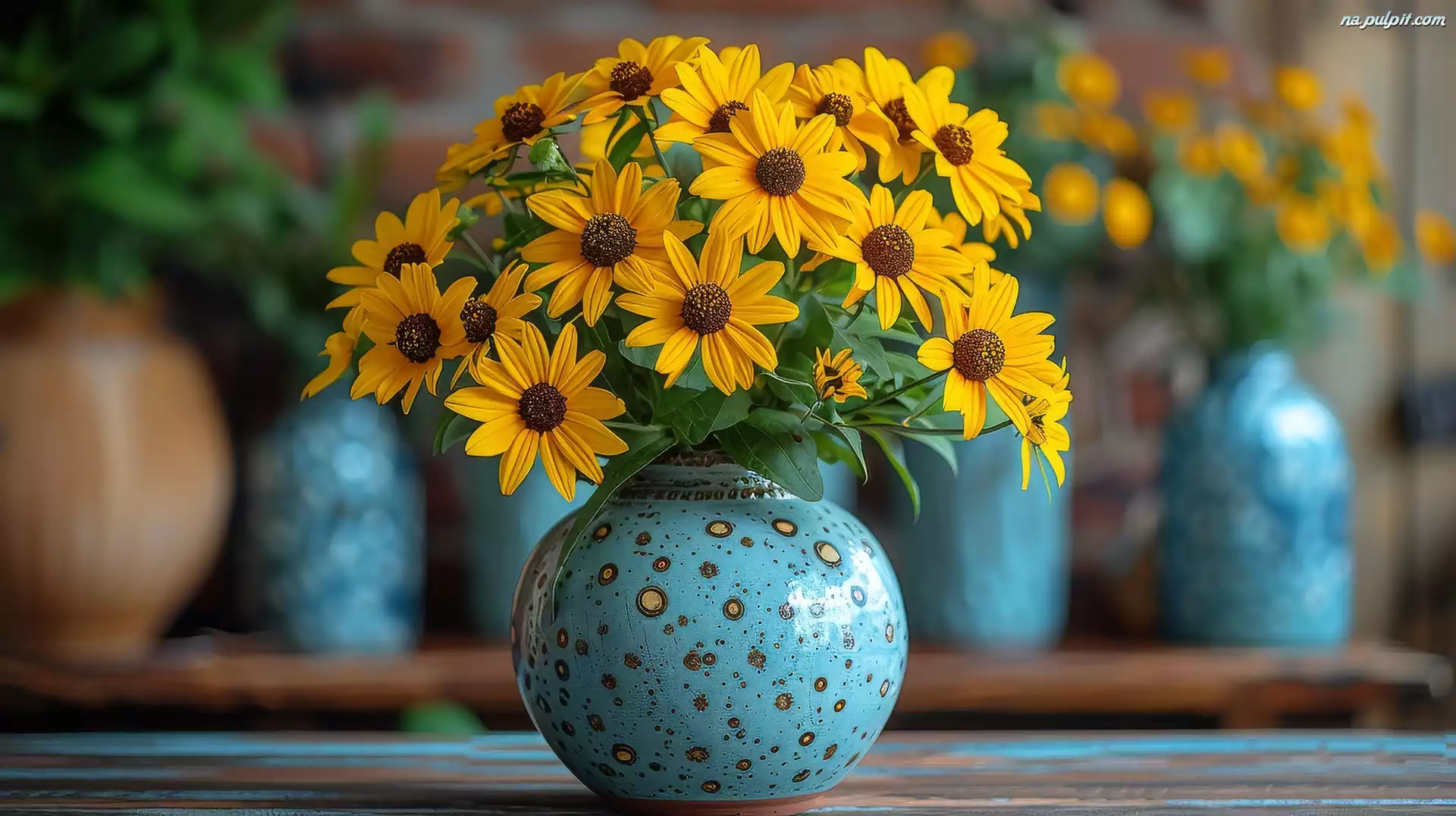 Niebieski, Bukiet, Kwiaty, Rudbekia, Żółte, Wazon