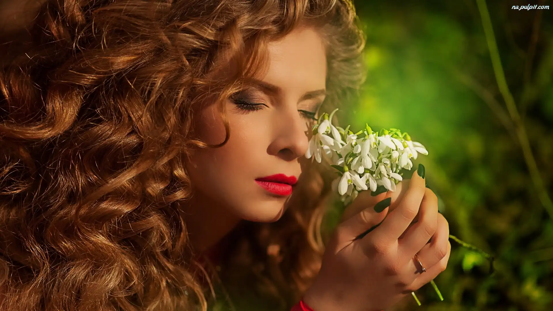 Rudowłosa, Kwiaty, Przebiśniegi, Zamknięte, Kobieta, Oczy Na Pulpit