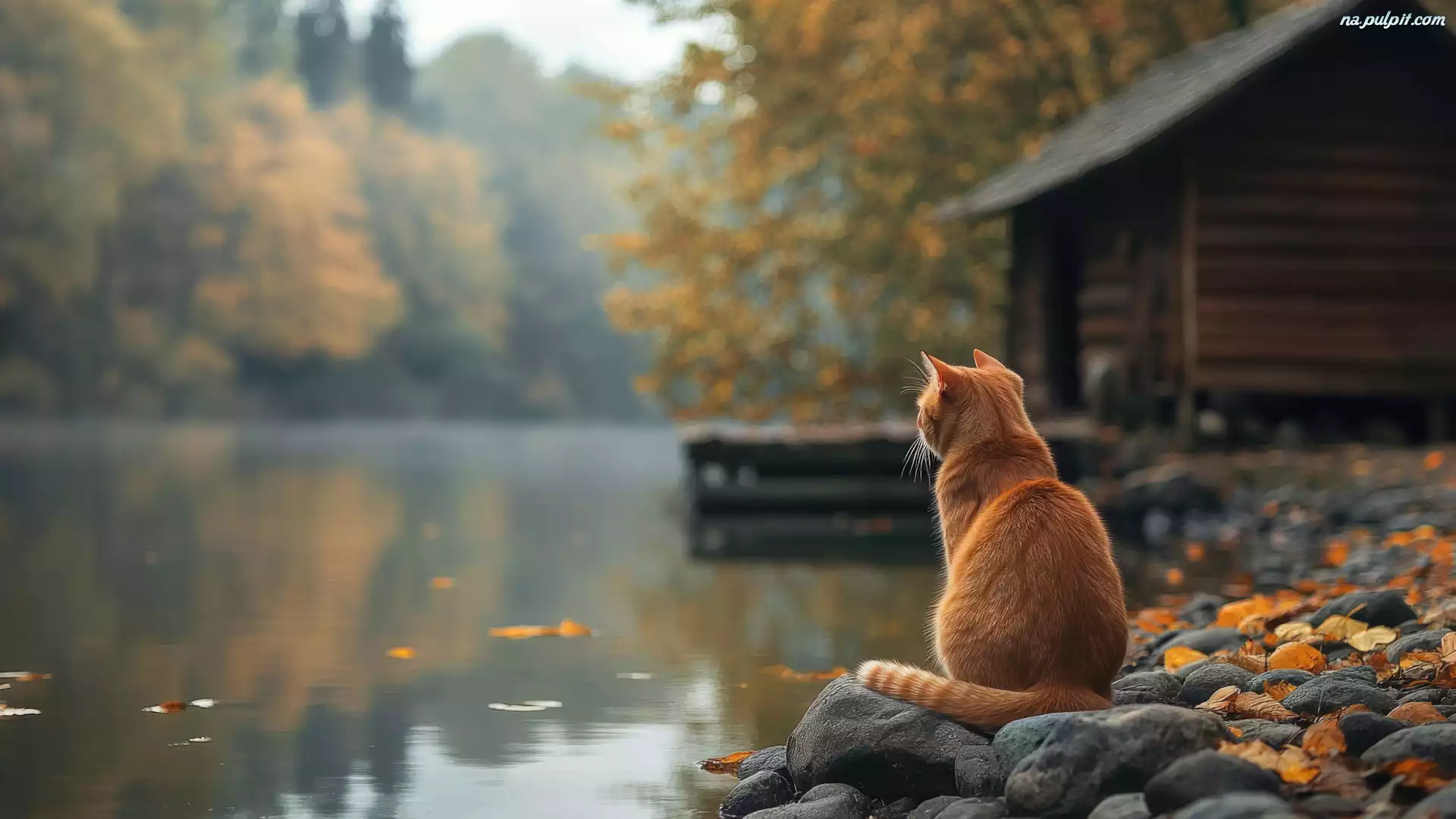 Jezioro, Rudy, Kot, Dom, Kamienie