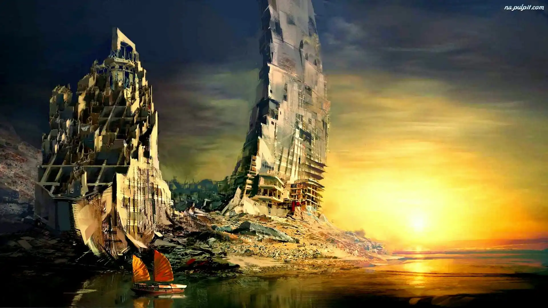 Ruiny, Zachód, Jezioro, Słońca Na Pulpit