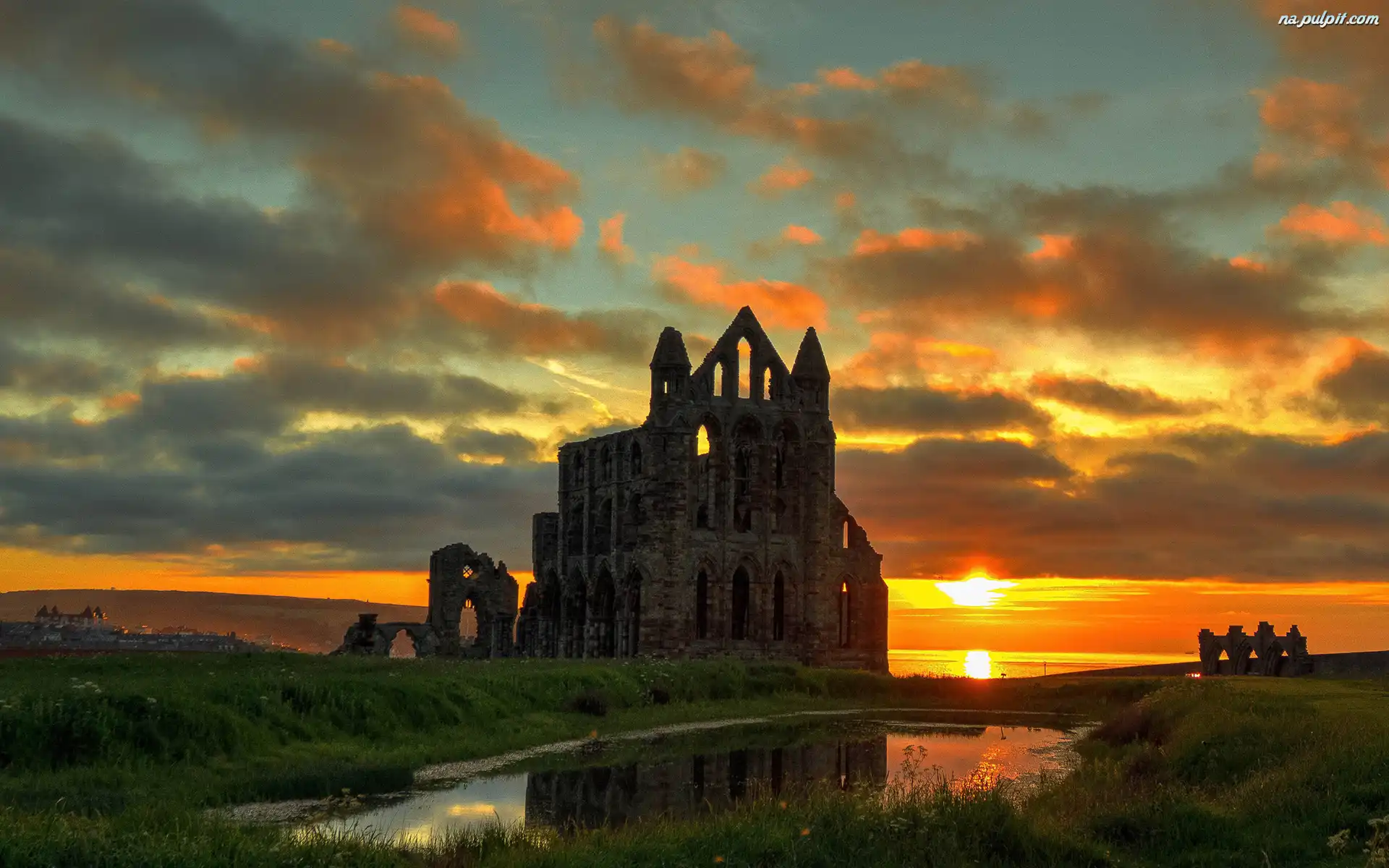 Ruiny, Zachód słońca, Rzeka, Chmury Na Pulpit