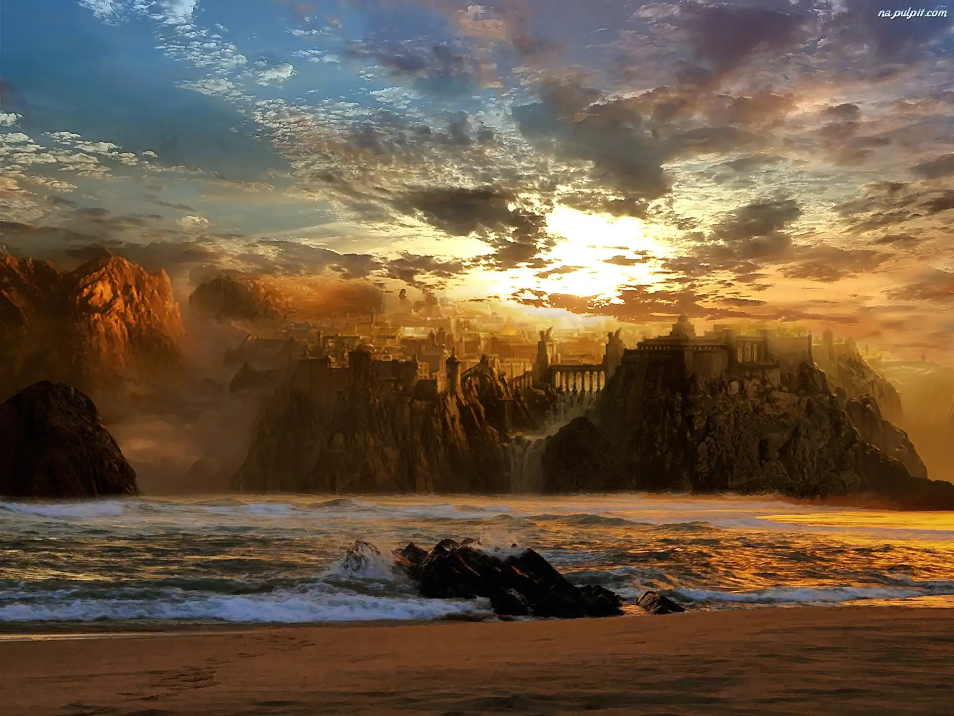 Ruiny, Morze, Słońca, Zachód, Skały Na Pulpit