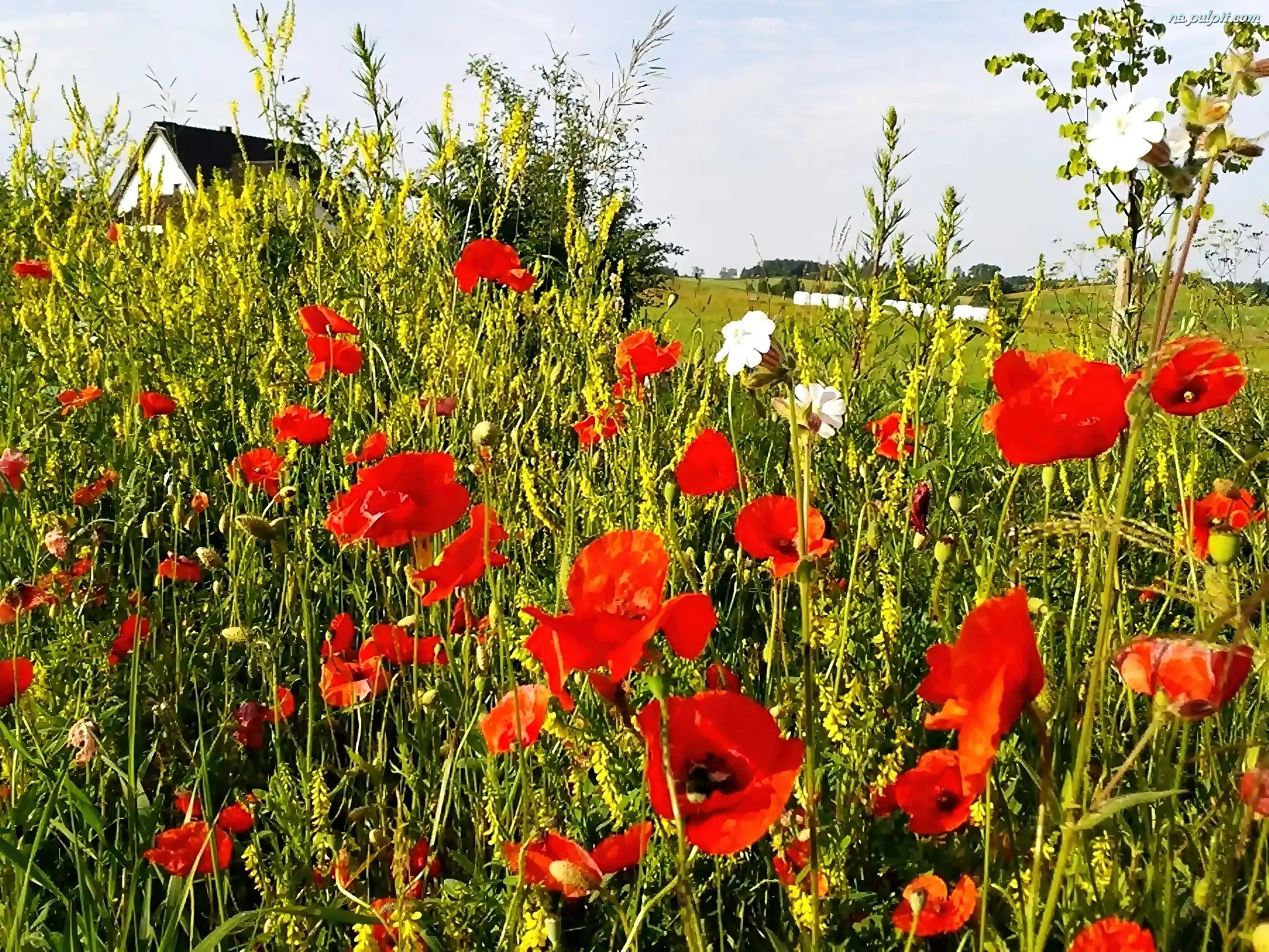 Góry, łąka Niebo, Kwiatki, Łąka, Zielona, Błękitne Drzewa, łąka Obłoki, Łąka, Zielona, Mały Domek płotek, Tęcza, łąka Czerwone, Maki łąka, Chmury Pszczoły, Czerwony, Mak Rumianki, Dziewczynka, Chabry, Kwiatów, Bukiet, Łąka, Polnych Księżyc, Łąka Kwiat, Rumianek Zielona, Błękitne, Niebo, Trawa, Łąka, Drzewo Rumianku, Kruszczyca, Na Łąka, Kwiaty, Maki