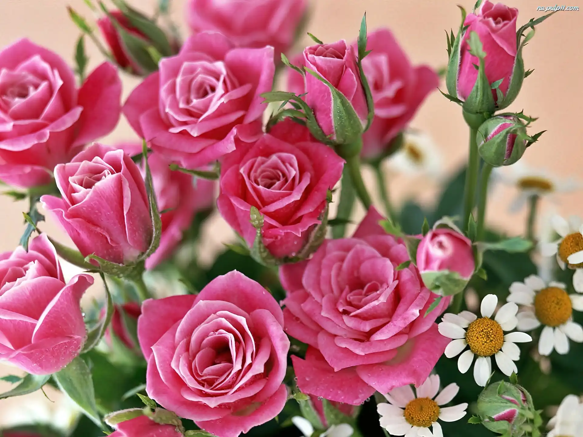 Rumianki, Różowych, Bukiet, Róż Na Pulpit