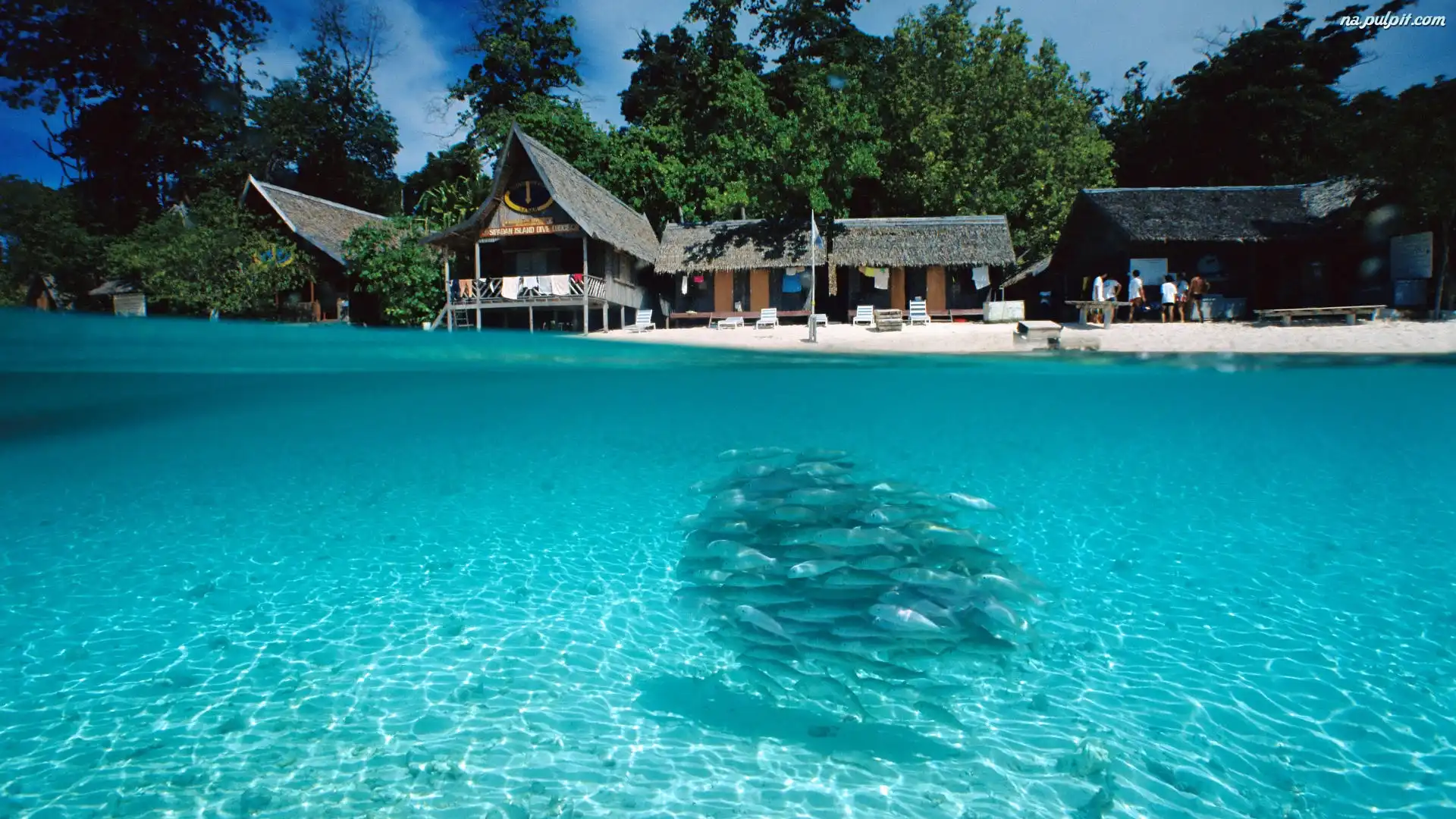 Rybki, Drzewa, Tropikalne, Domki, Morze, Letniskowe Na Pulpit