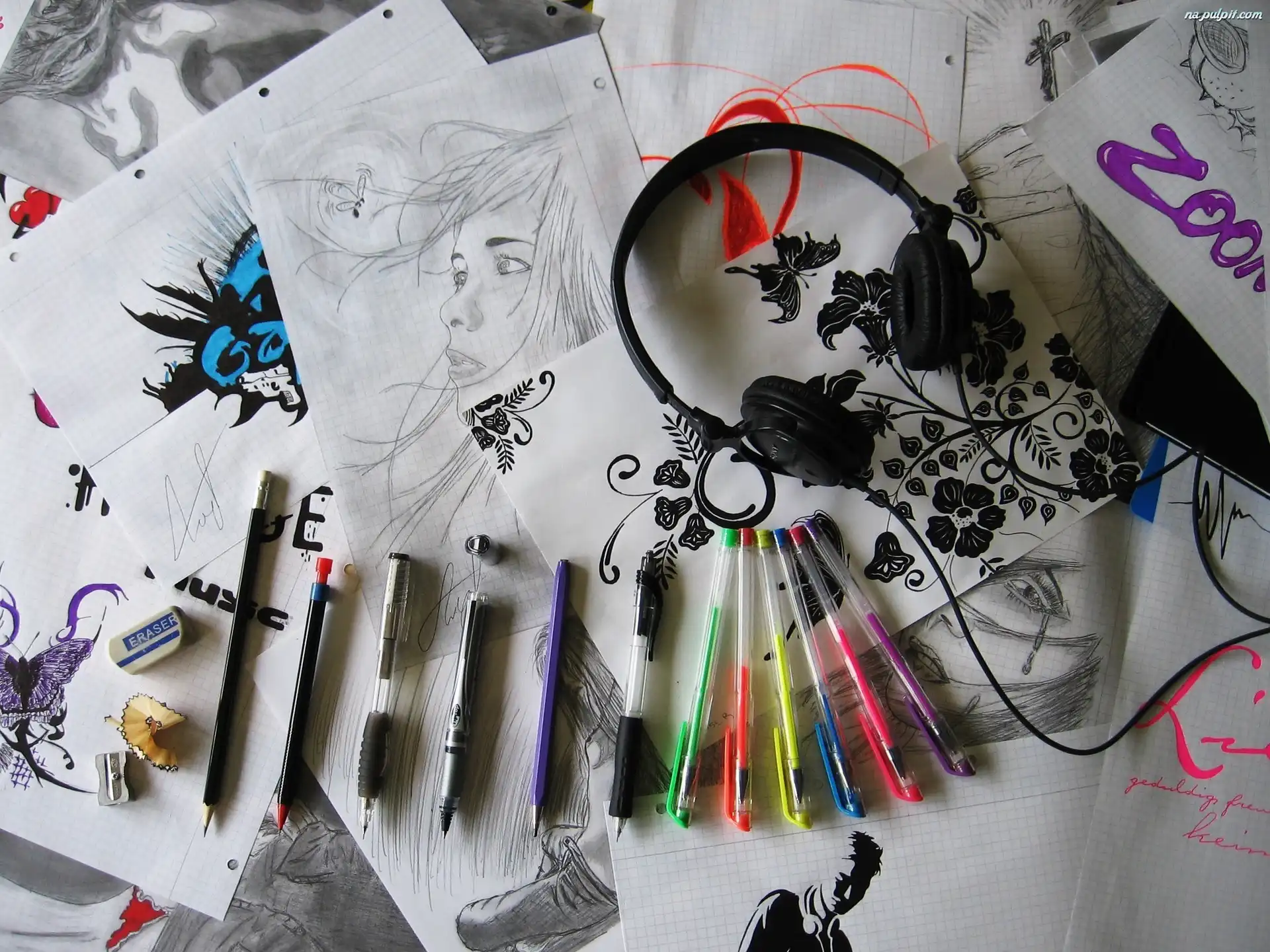 Rysunki, Ołówki, Długopisy, Słuchawki