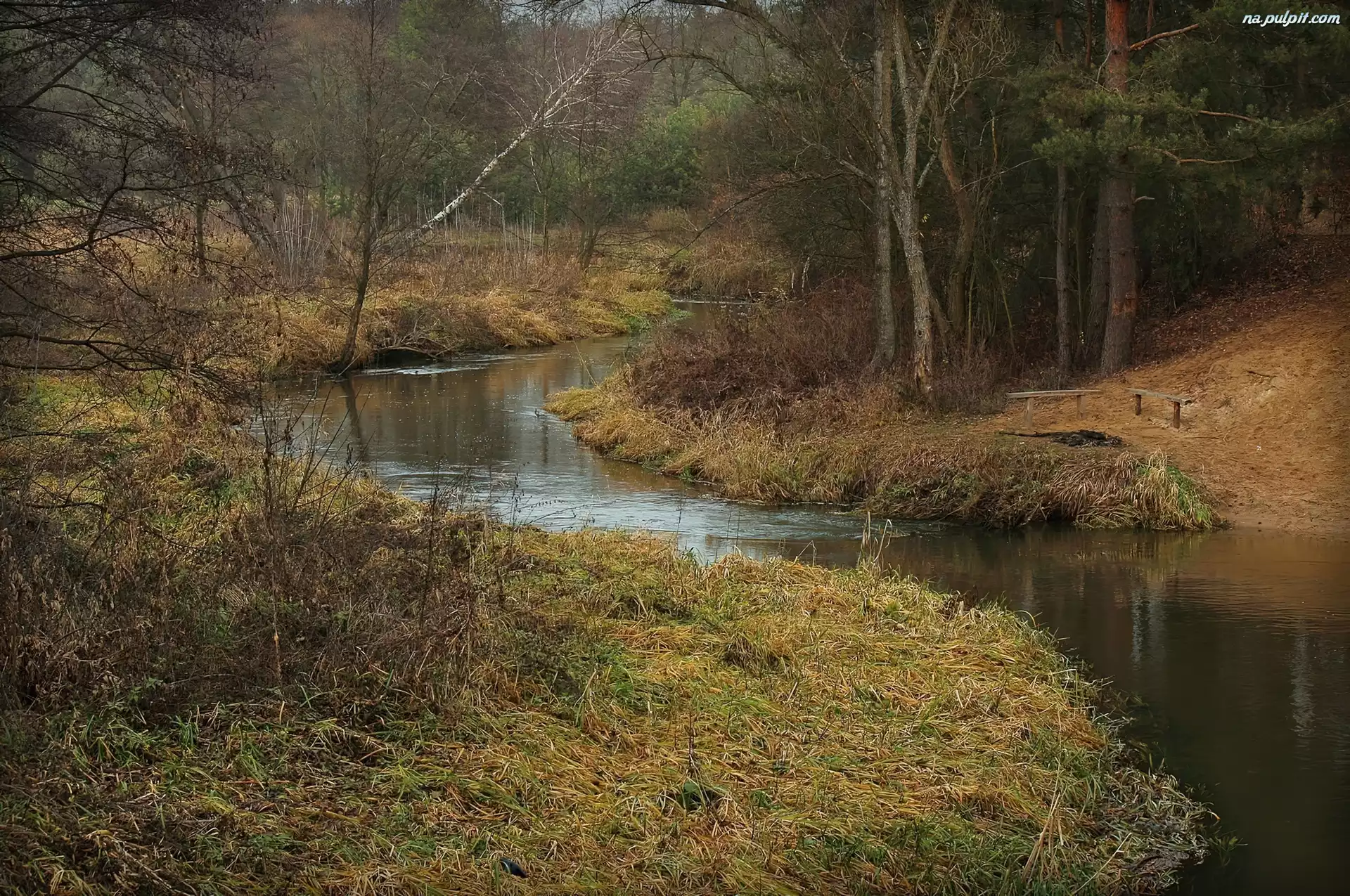 Ławeczki, Drzewa, Kręta, Rzeczka, Trawa Na Pulpit